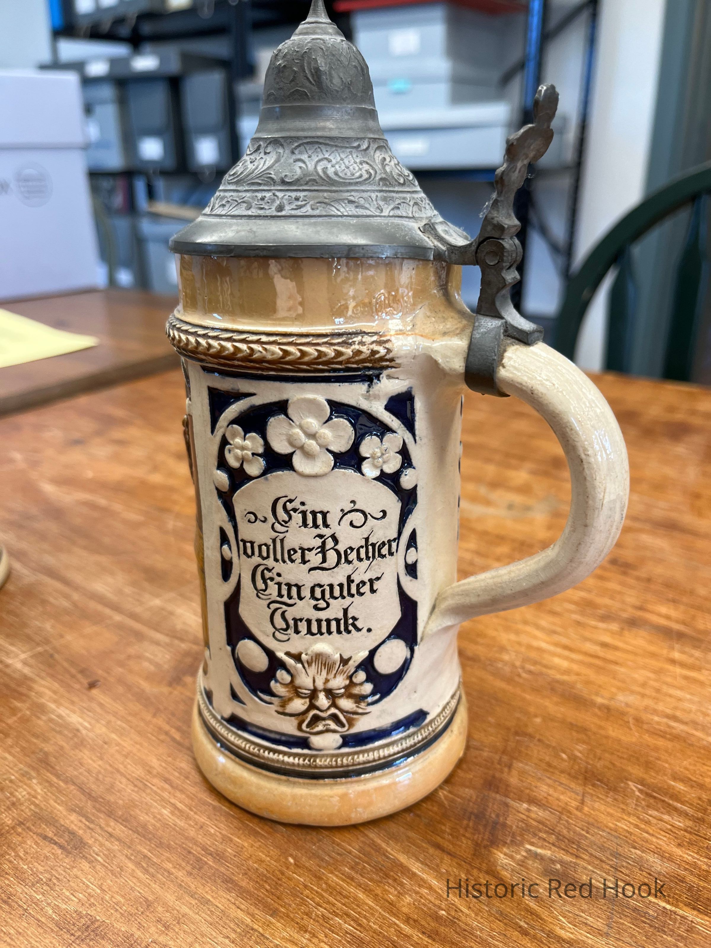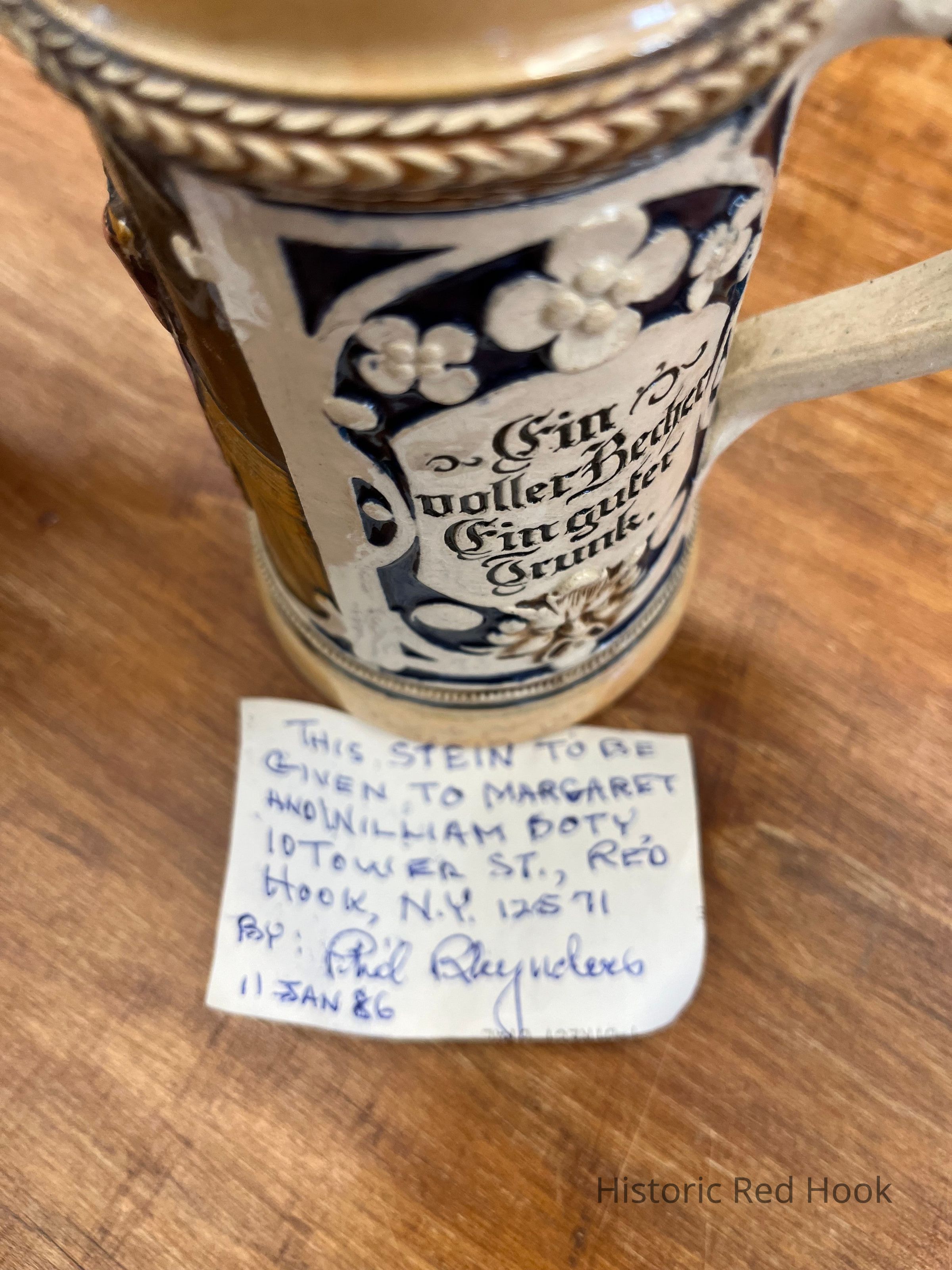 Beer stein given to Margaret and William Doty by Phil Rhynders, January 11, 1986. Margaret's daughter said it was used in Red Hook Hotel.Collection