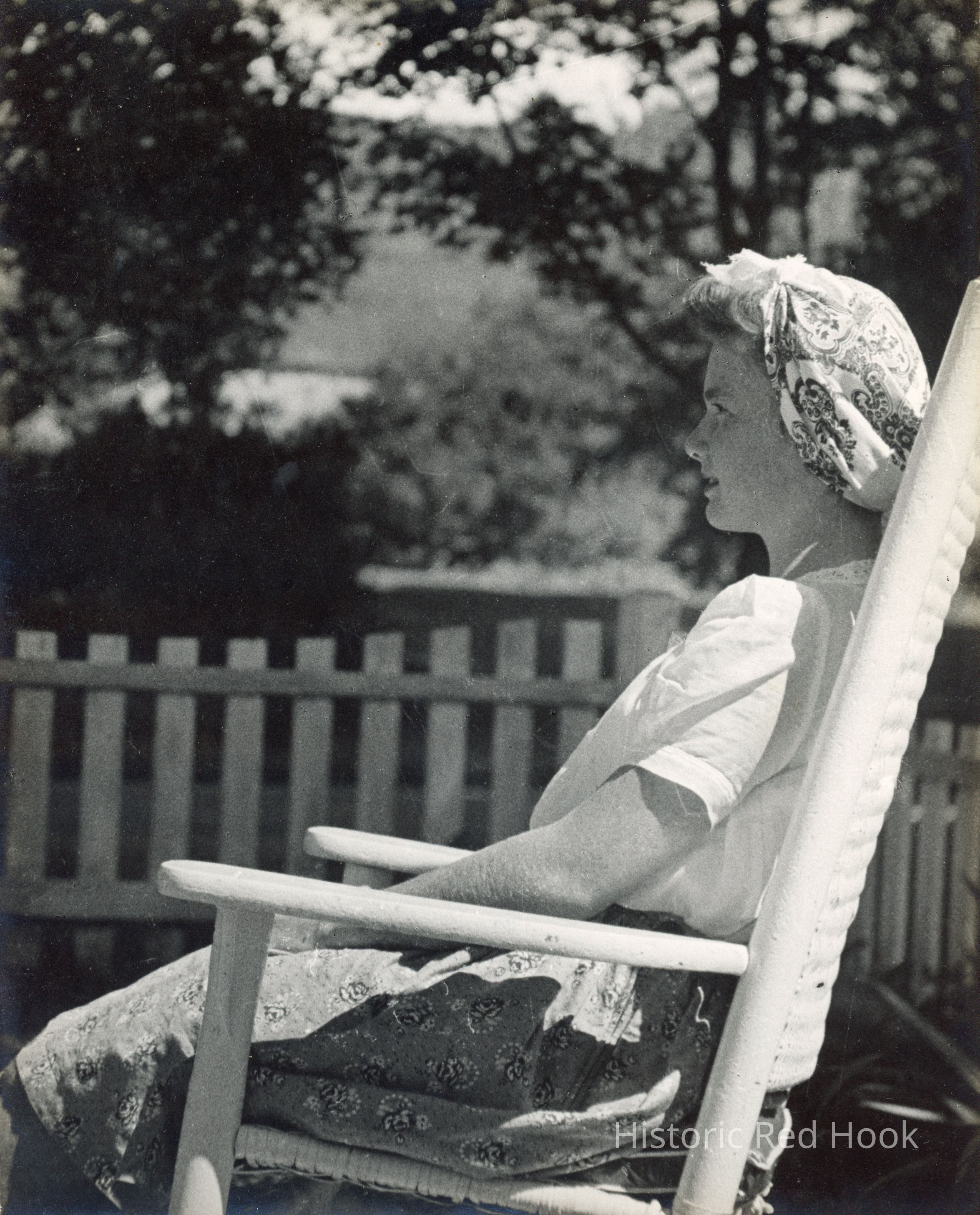 Beth Mead as a young woman, seated on a rocking chair on porch.Photograph Details