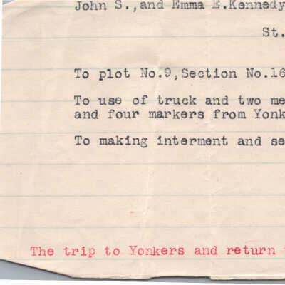 John & Emma Kennedy burial plot purchase indenture and receipt for Lot # 9 in St. Paul's Lutheran Cemetery, 1921Relationships