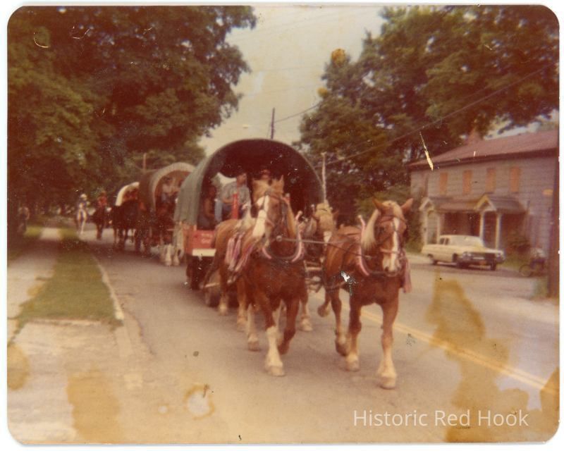 Bicentennial Wagon train parade, 1975. Horses and covered wagons proceeding south on North Broadway, passing the Elmendorph Inn, which is shuttered. Original Kodak color print.Photograph Details