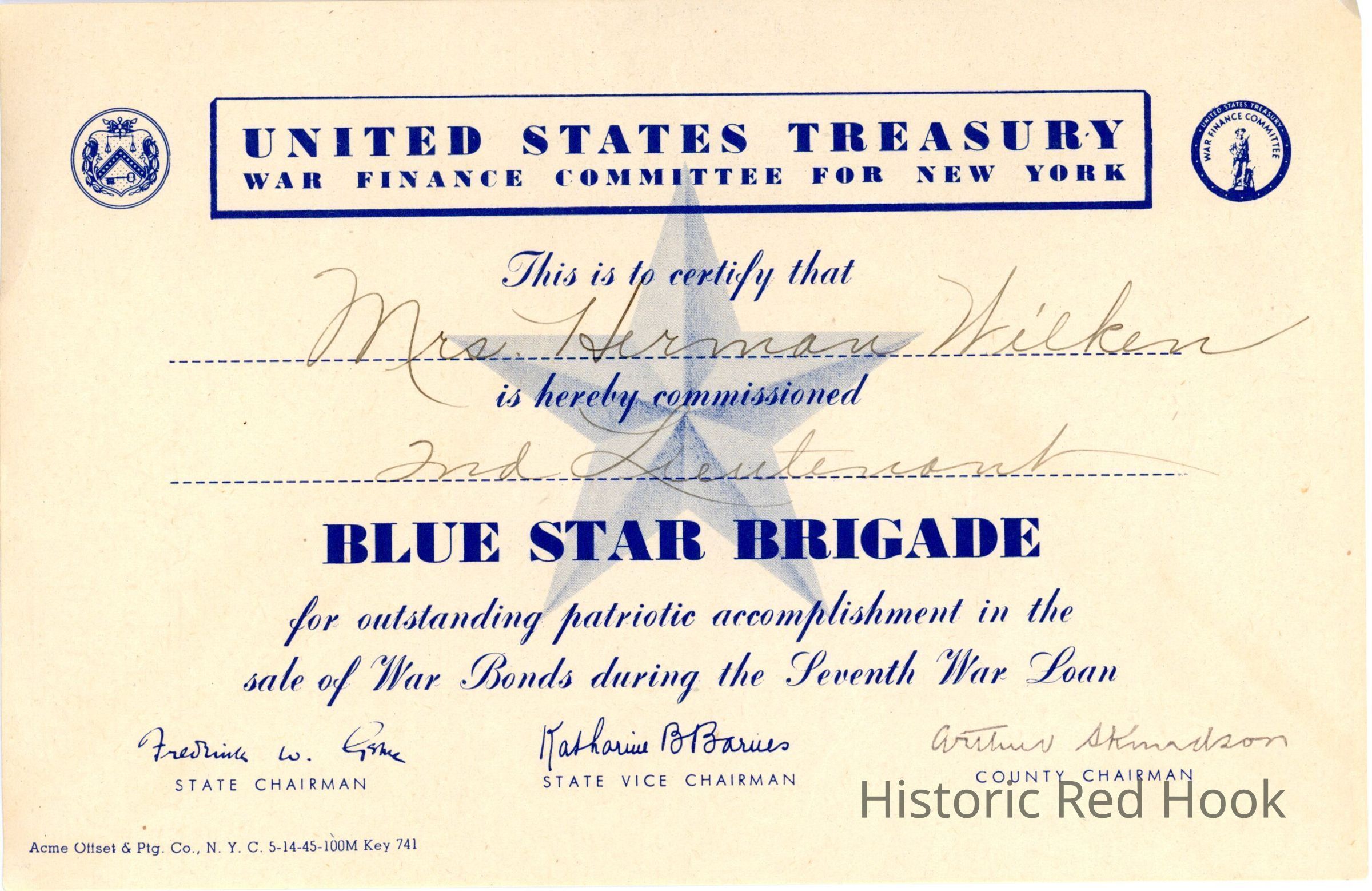 U.S. Treasury New York War Finance Committee commissioning certificate as 2nd Lieutenant in. the Blue Star Brigade, for Mrs. Herman Wilken (Augusta Wilken) , mother of Herbert Wilken.Collection