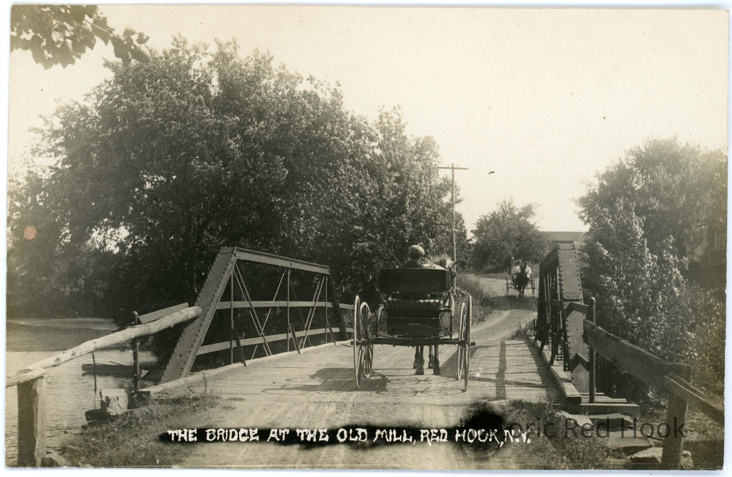 Bridge at the Old Mill, Red Hook, N.Y. Rear of horse and buggy crossing bridge over Mill Pond and another coming the other way.Subject Place