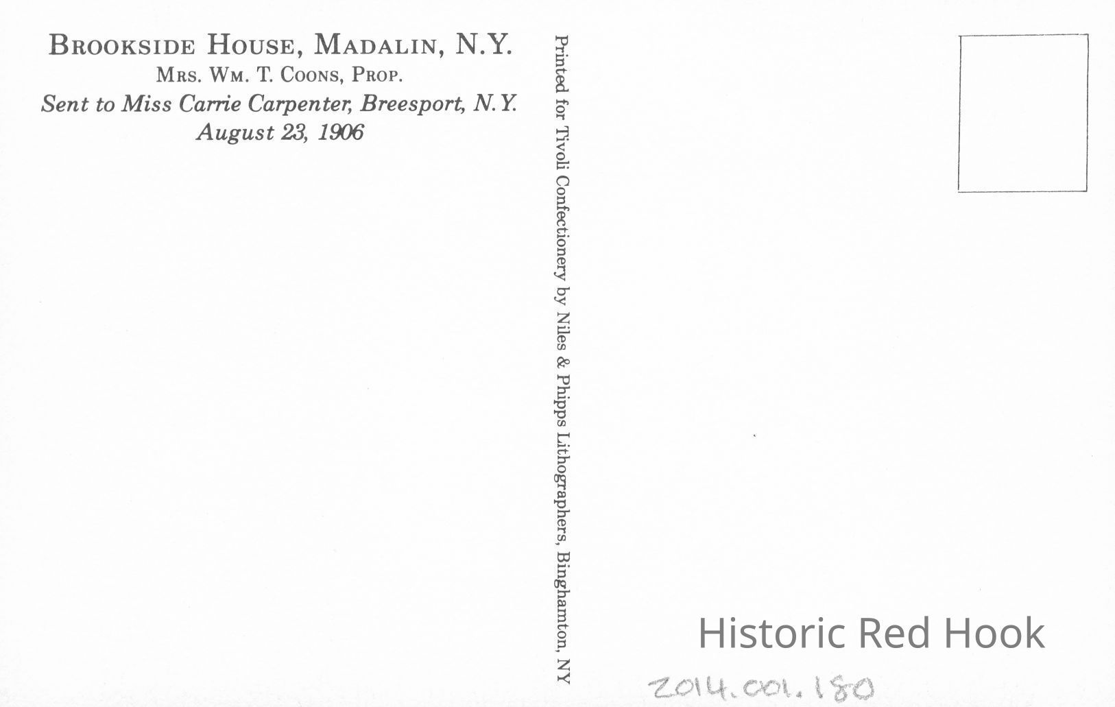 Post card of the Brookside House, Madalin, N.Y. This house has been remodeled into 3 apartments. It is on 75 Montgomery Street in the Village of Tivoli.The creek is in back of the house and barn. The barn is still standing.Subject Place