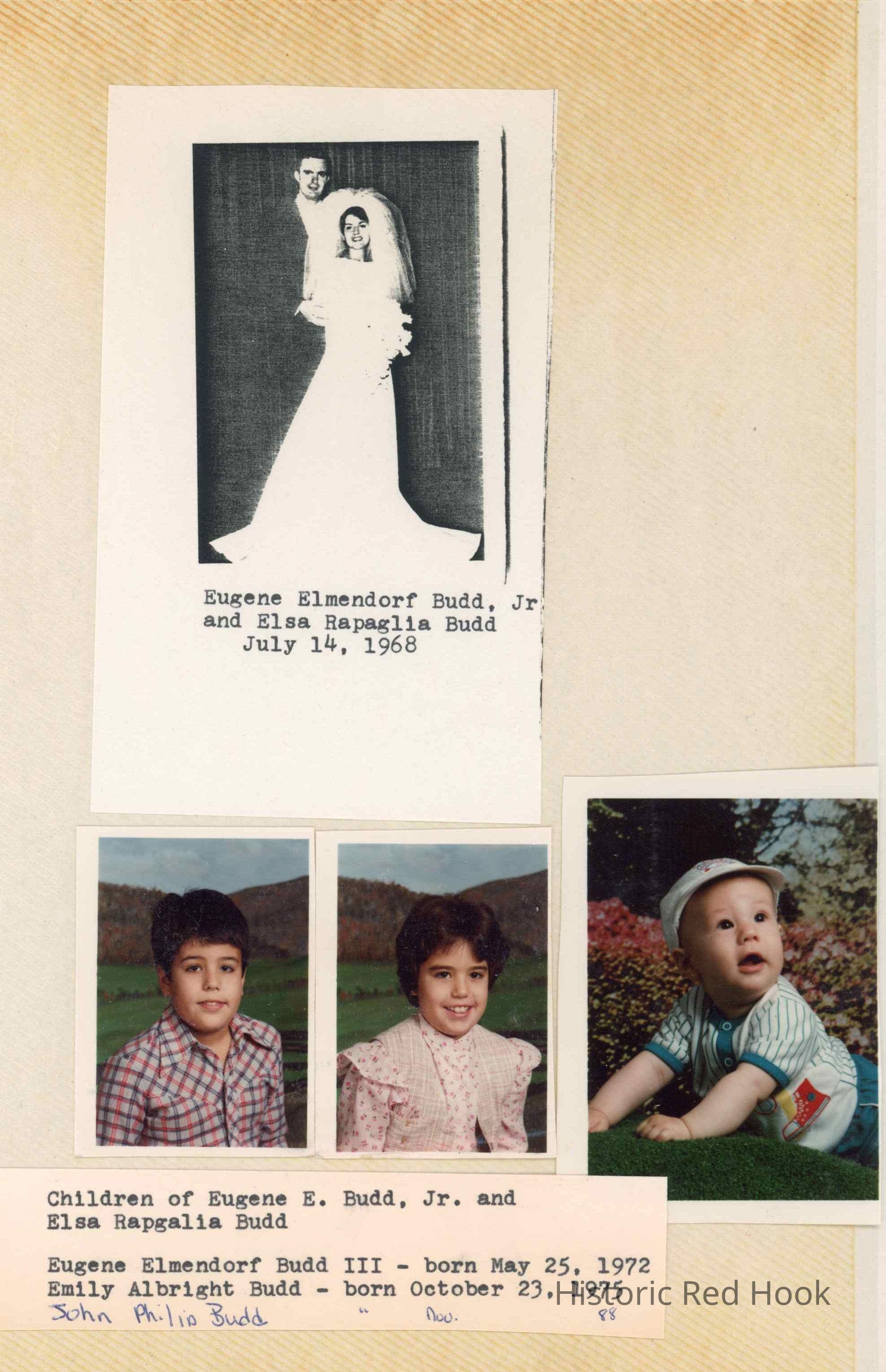 Photos of Eugene Elmendorf Budd, Elsa Budd and their children Eugene Elmendorf III, Emily Albright, John Philip. Also photos of Thomas Albright Budd, Mary Katherine Fraleigh and their children, Stephen, Karen, David.