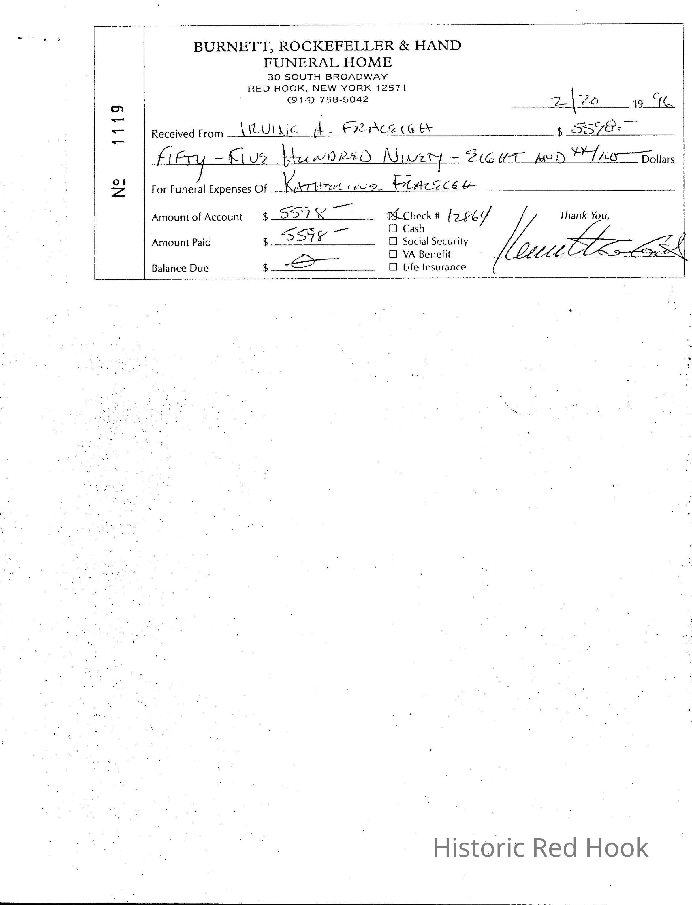 Burnett, Rockefeller & Hand Funeral Home receipt, Feb. 20, 1996 to Irving Fraleigh for funeral expenses for Katherine Fraleigh.Relationships