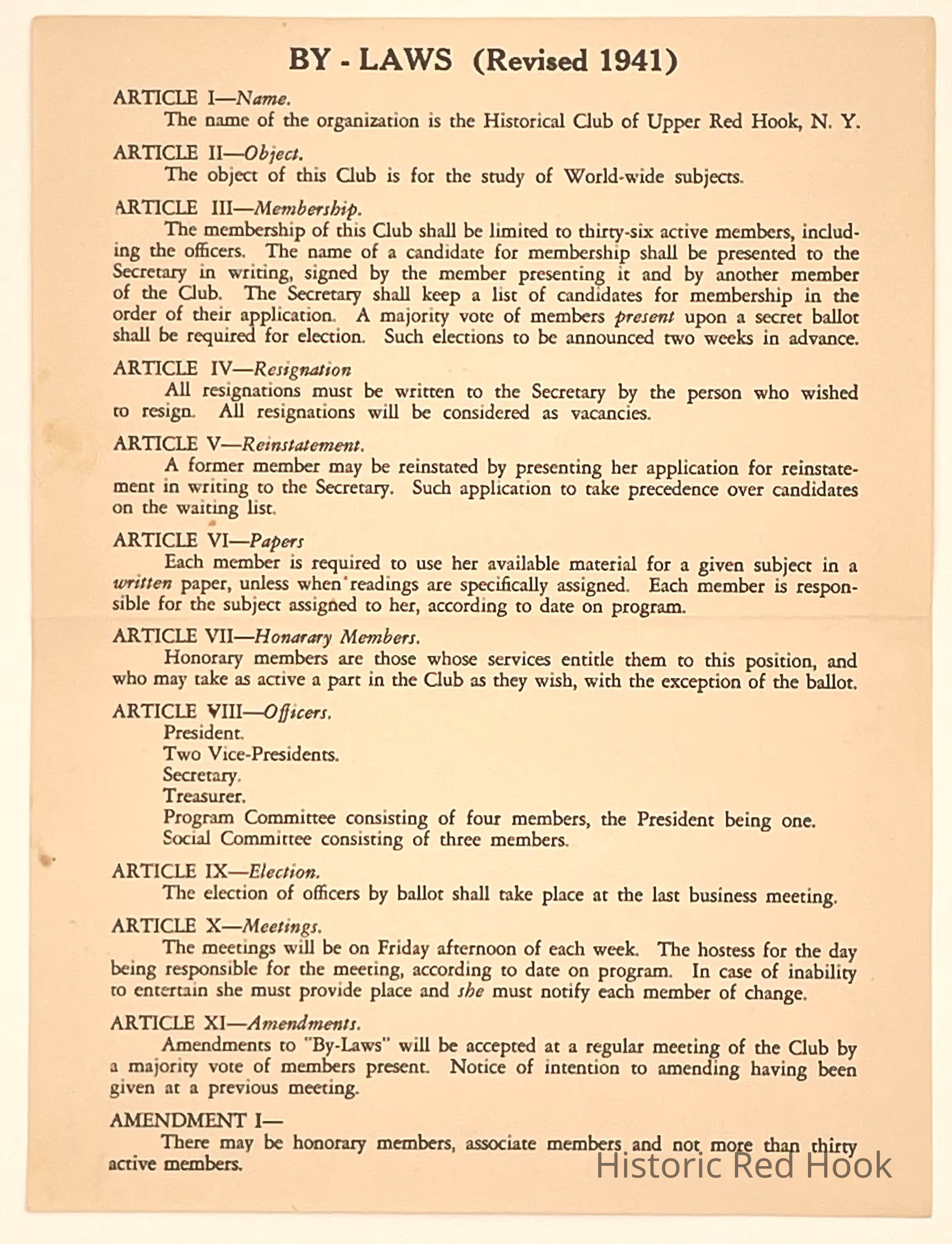 By-Laws of The Historical Club of Upper Red Hook. (Revised 1941)