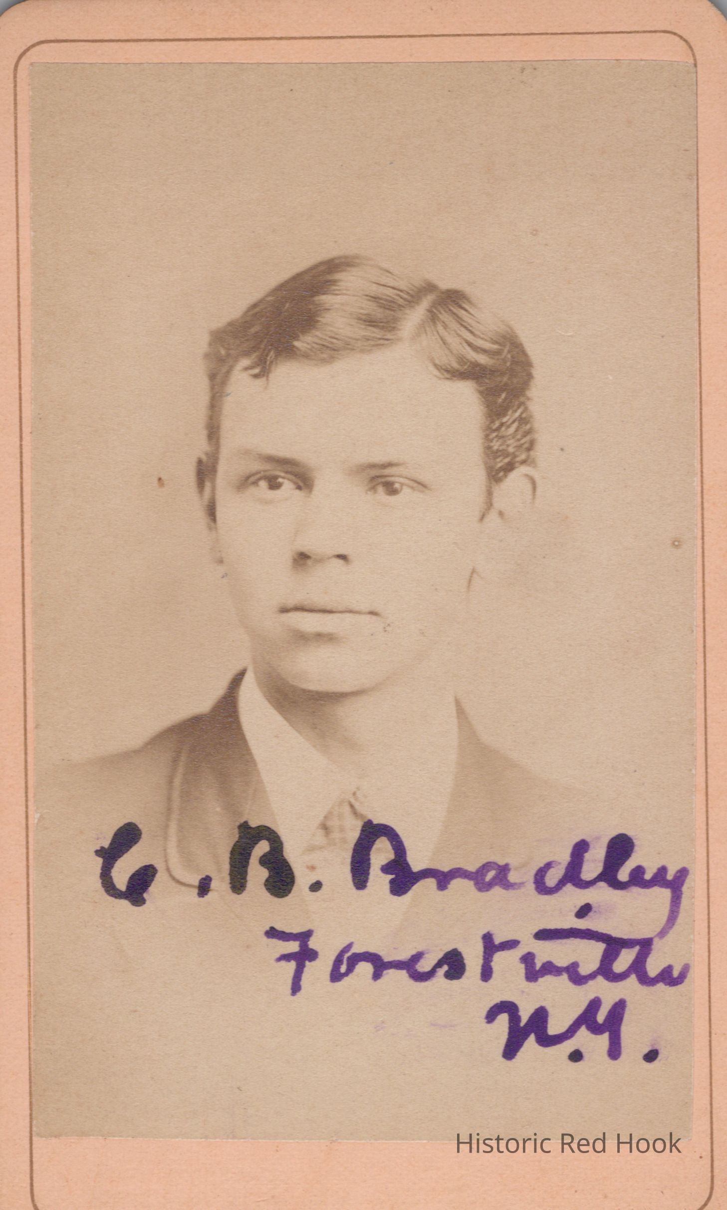 A formal portrait taken at a photographic studio in Ithaca, New York of C. B. Bradley from Forestville, New York, Cornell 1873.