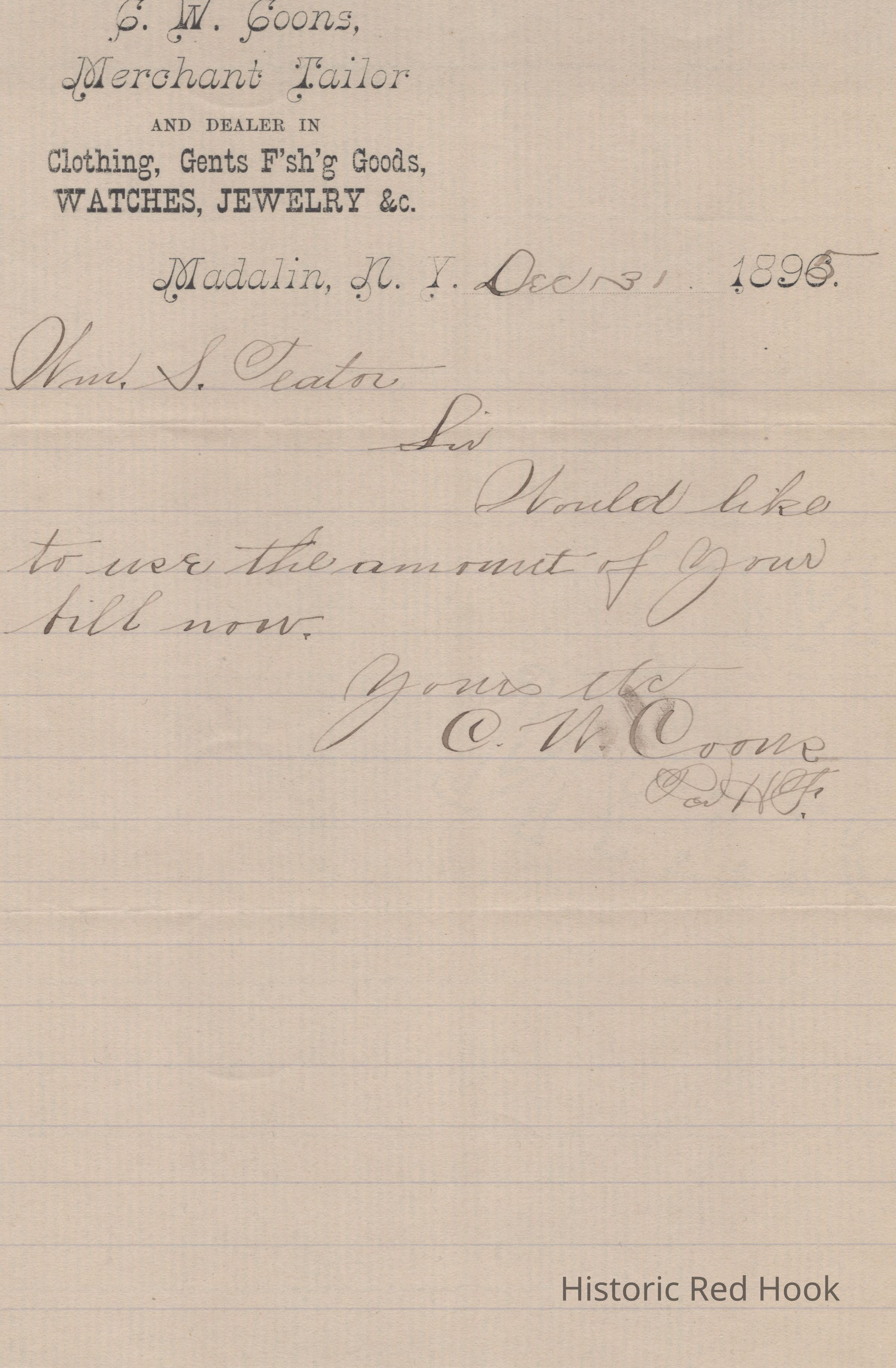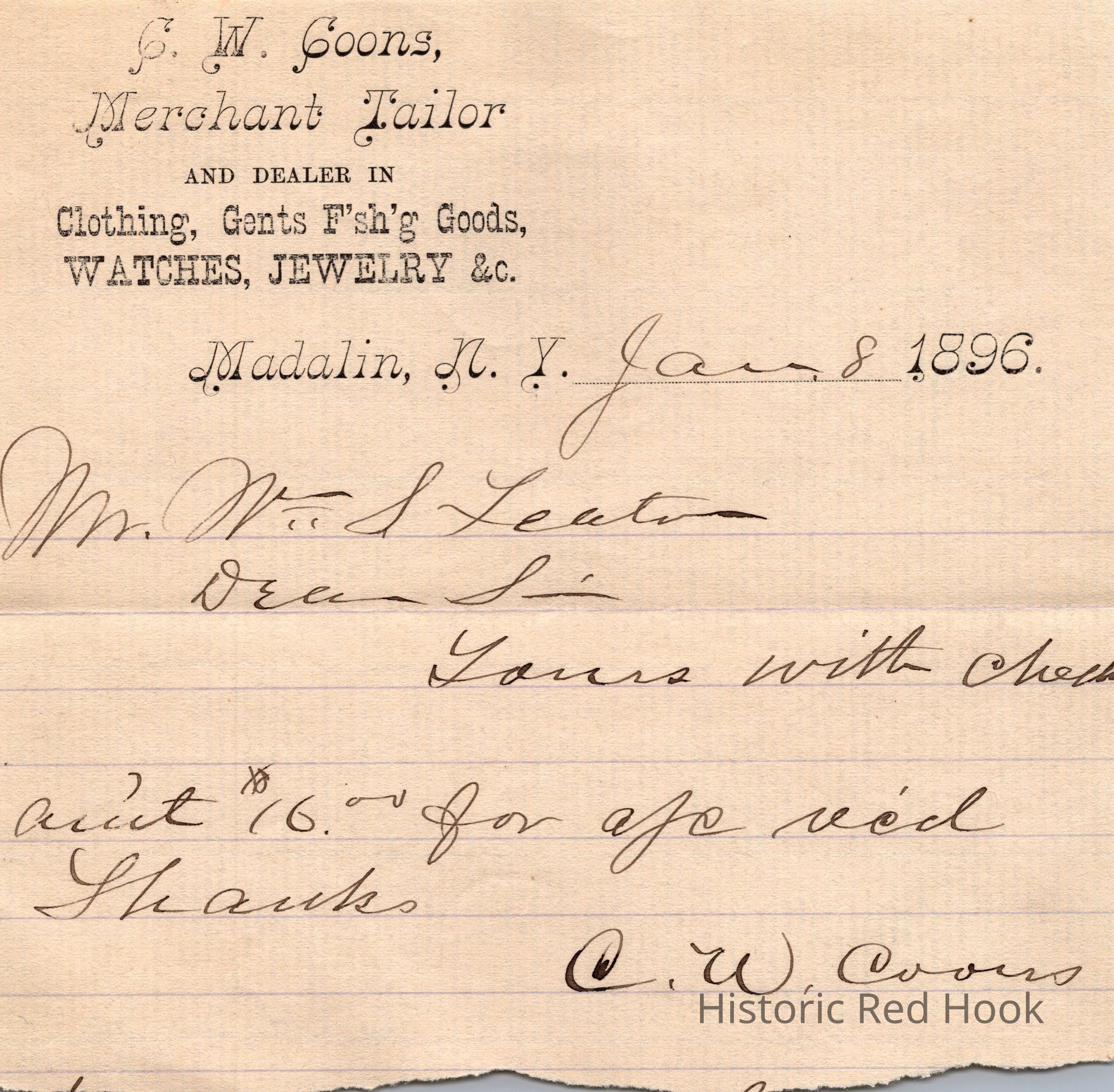 A receipt from C. W. Coons Merchant Tailor, Madalin, N. Y., addressed to Wm. S. Teator dated Dec. 31, 1895 and Jan 8, 1896.Relationships