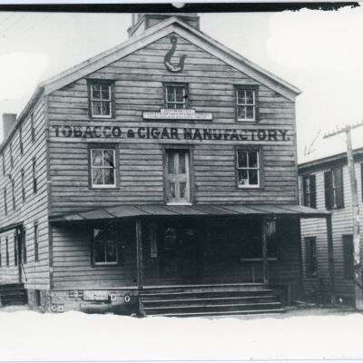 Building belonging to Hoffman & Company, Tobacco & Cigar Manufactory; Charles Hoffman, Wm. B. Massoneau, Frank Sheldon, William E. Traver; also, in the 1950s, home to Andy's Restaurant, favorite teenager hangout after basketball games, and (Joseph) McMichael's Jewelry (as of this 2016 notation, the store's clock hangs in the Village Building courtroom). Two identical photos but one is marked with 1950s businesses.Photograph Details