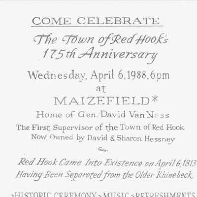 This booklet and flyer were produced for the 175th Anniversary of Maizefield held on April 6, 1988. The booklet contains a brief history of Maizefield written by Clare O'Neill Carr, a copy of an 1815 map of the Town of Red Hook, an article about David Van Ness, an opinion article from the Gazette Advertiser and an insert with the sheet music of "America The Beautiful" .Collection