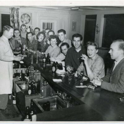 Howard Laib (hotel owner) tending bar for Bard College professor and students in the Elbow Room of the Red Hook Hotel, January 1947.Photograph Details
