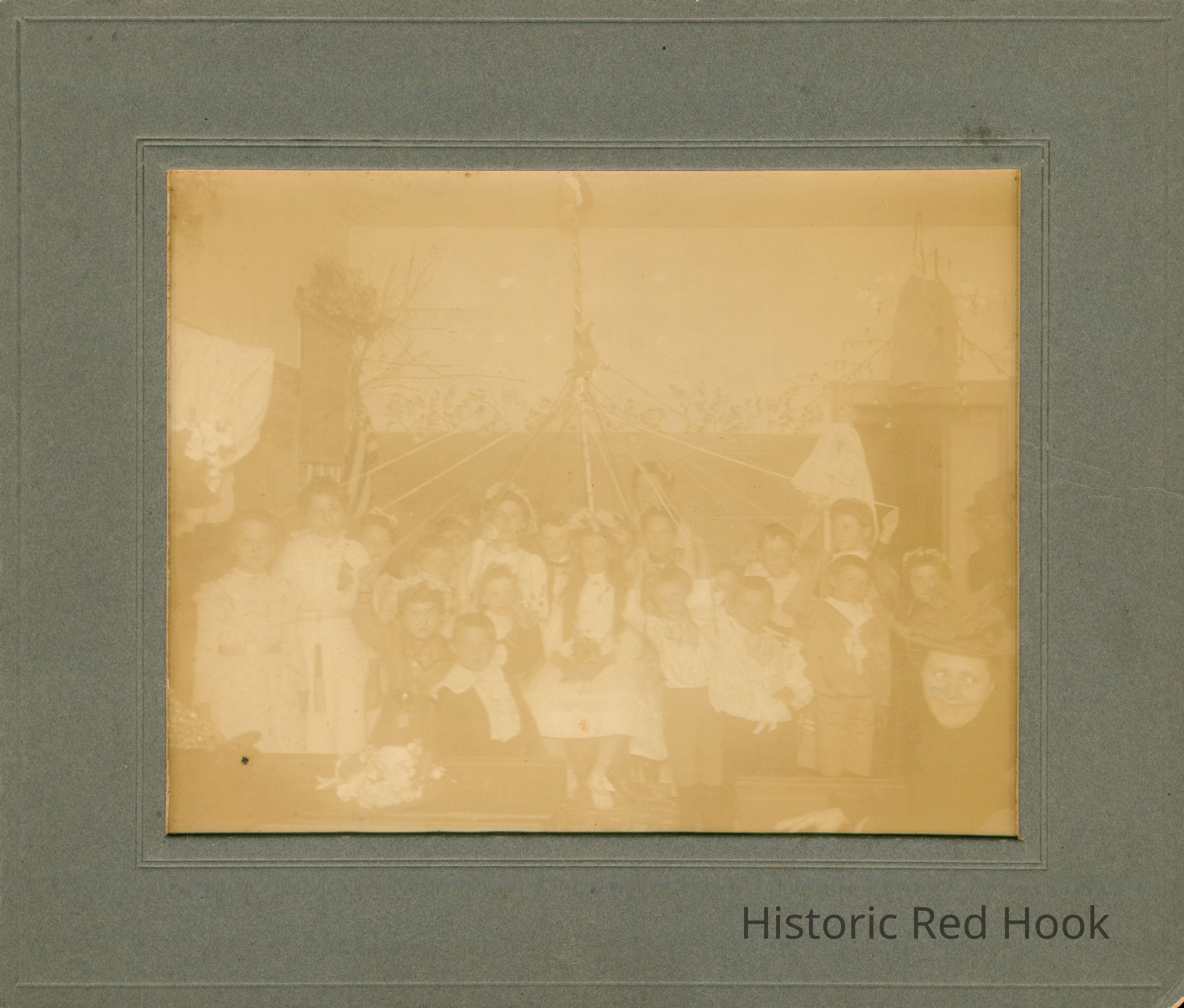 Photograph mounted on cardboard of teacher Rosalie Fraleigh and her class at the Fraleigh School engaged in a maypole activity, May 1902. Rosalie Fraleigh taught from 1889 to 1906. The quote written at the top of the blackboard behind the class reads "A Moment Lost is Forever lost."Photograph Details