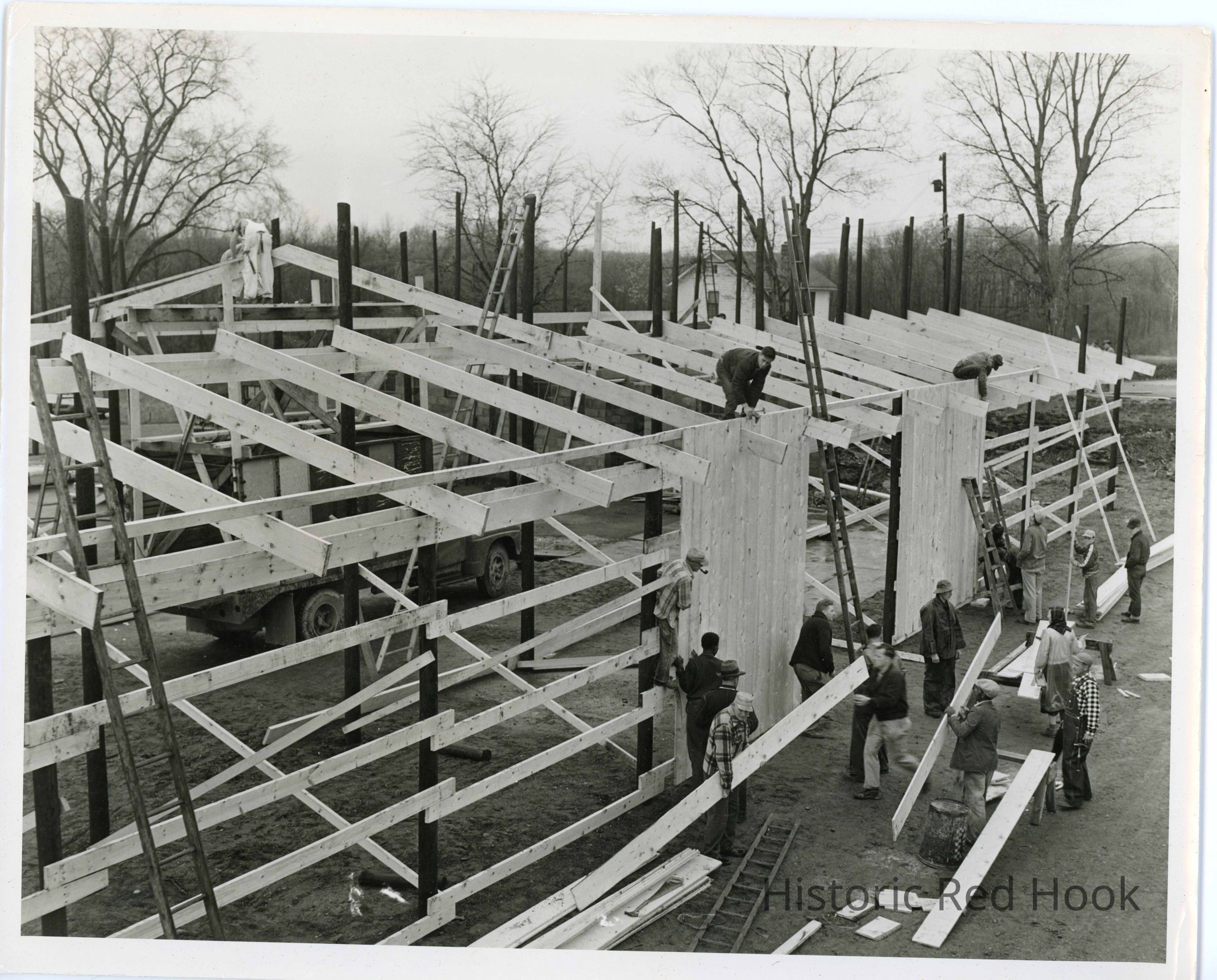 Barn-raising on Thomson property. Workers putting siding on pole barn.Collection