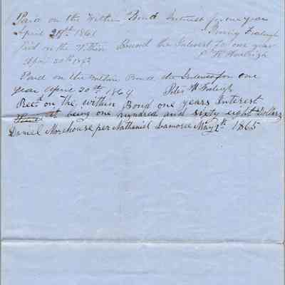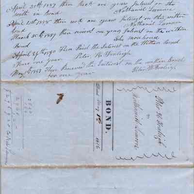 Bond for $5,600, May 1, 1856. Peter H. Fraleigh to Nathaniel Lomoree (sp?). Marked paid as of 1867.