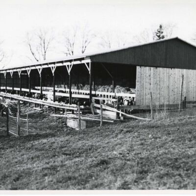 Barn-raising on Thomson property. Finished barn with cows feeding.Collection