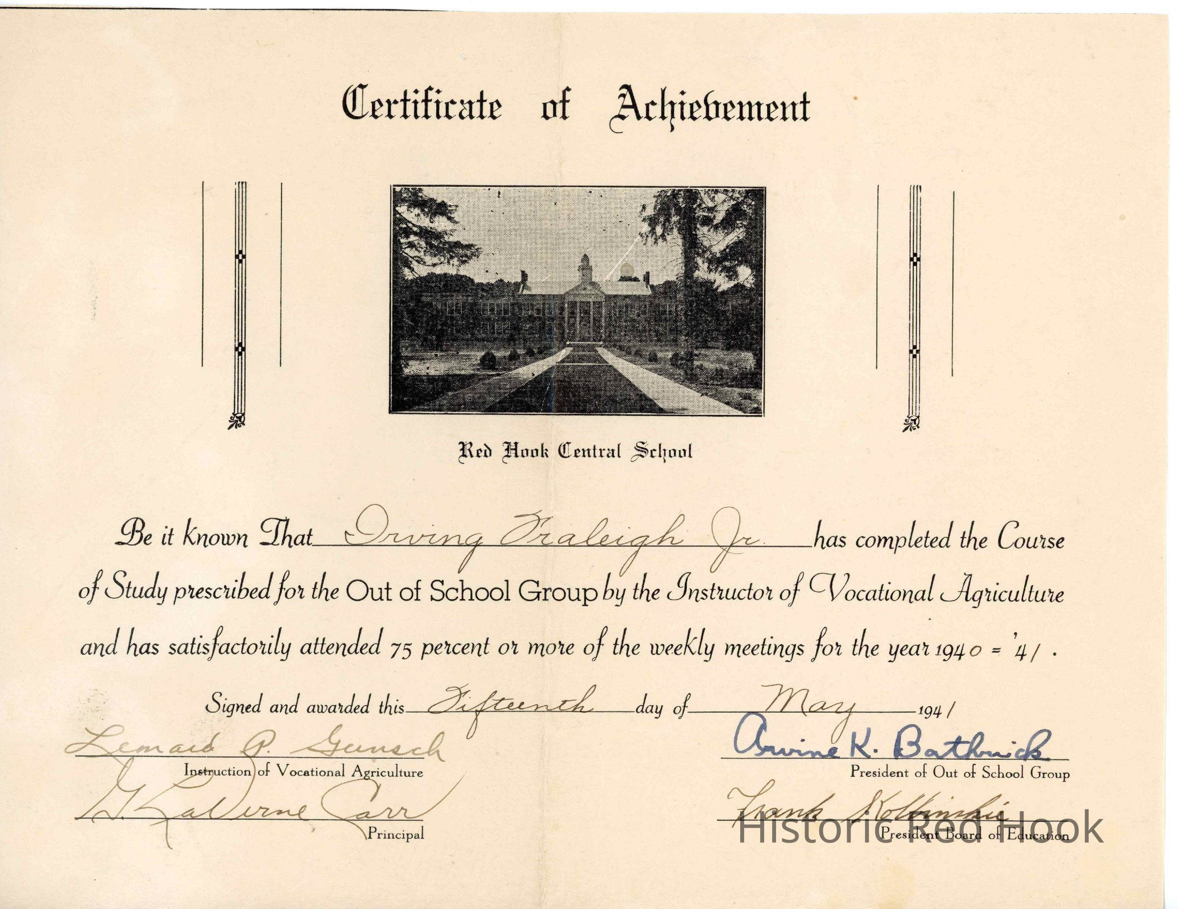 Certificate of Achievement for Vocational Agriculture, 1940-1941, Irving A. Fraleigh (Jr.)