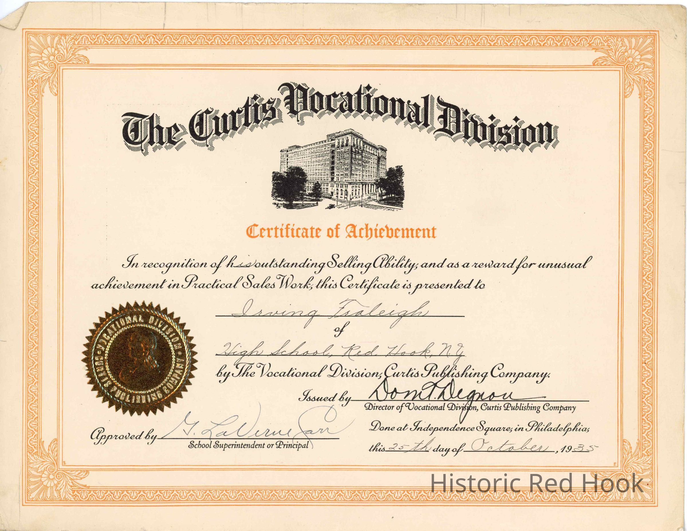 Certificate of Achievement, Irving A. Fraleigh
