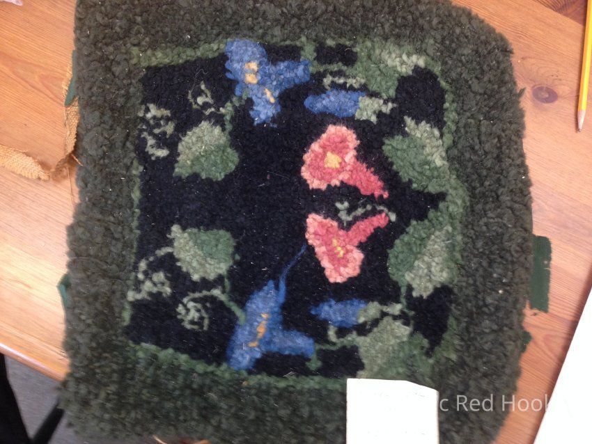 Hooked seat cover for chair (belonged to Frank Teal?) black background with blue ad pink flowers