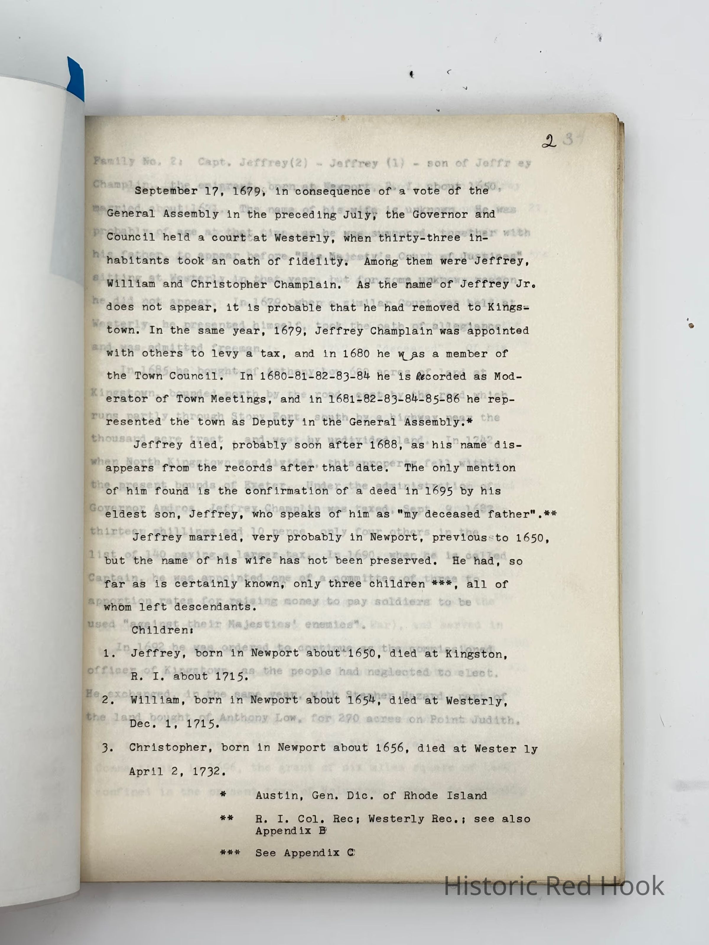 This typed volume covers history of the Champlin family in America from about 1650 to the 1920's in various locations which include New England and some in New York state. For some persons, educational, professional and other information is provided.