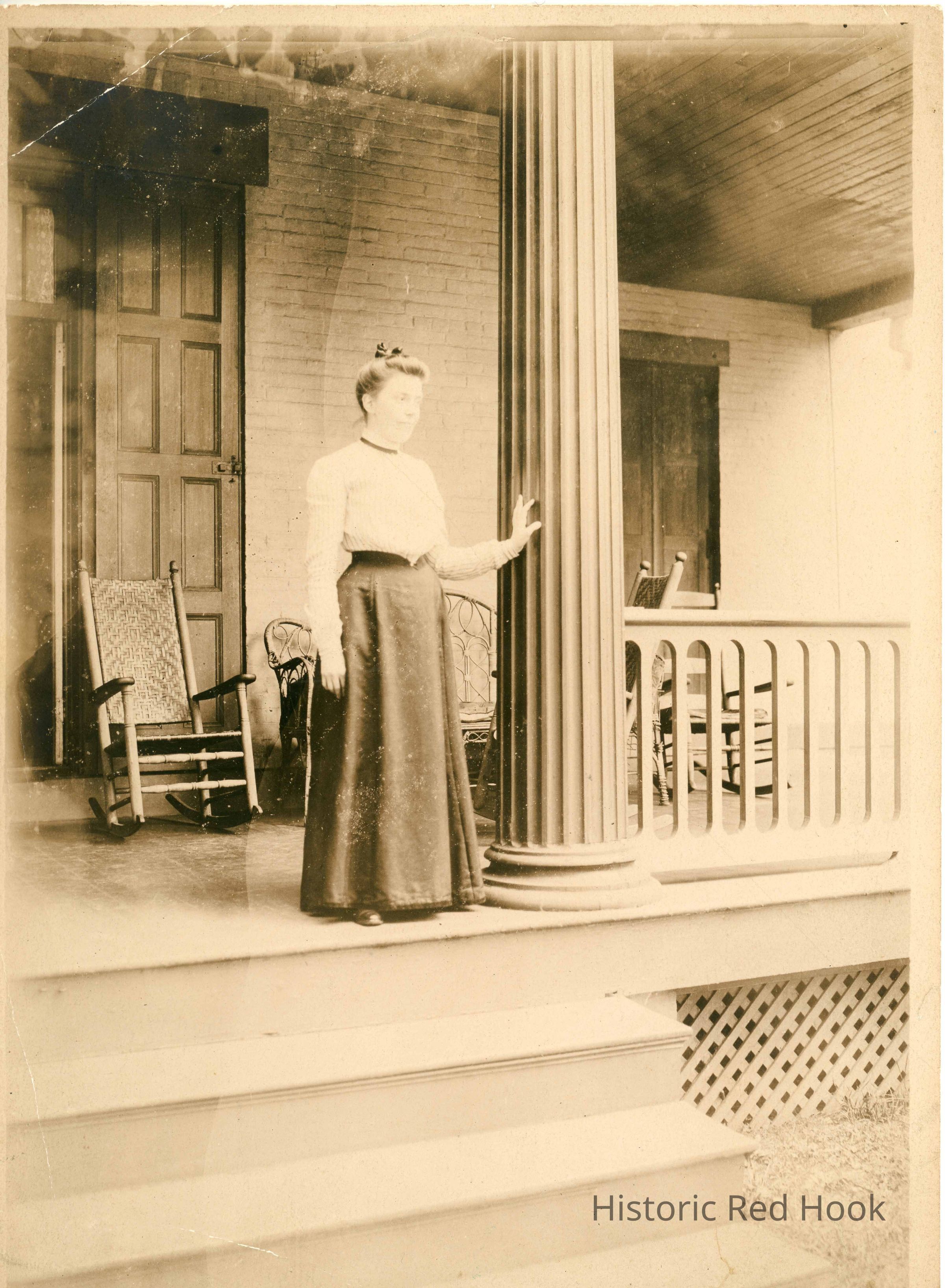 Photograph of a young woman on the porch of a house identified as across from the yellow house (Charity Myers)Photograph Details