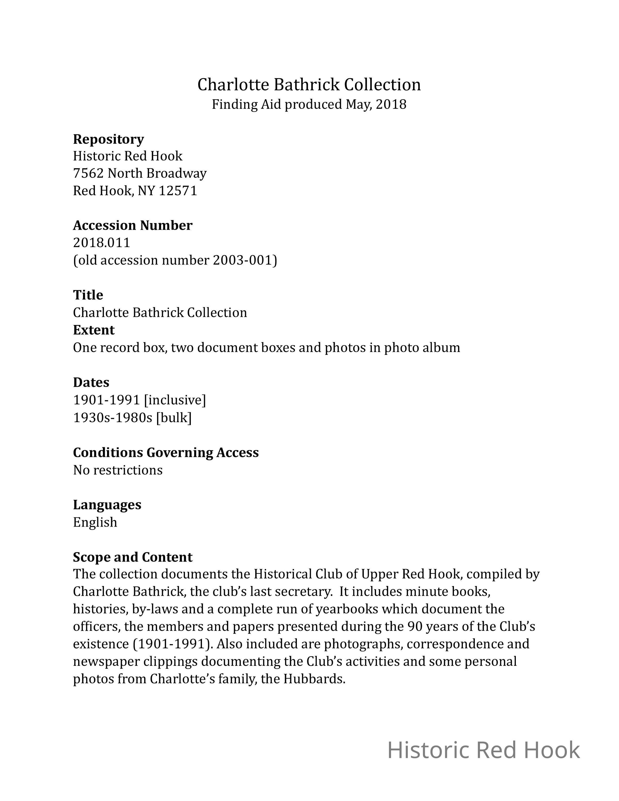 The collection documents the Historical Club of Upper Red Hook, compiled by Charlotte Bathrick, the club’s last secretary. It includes minute books, histories, by-laws and a complete run of yearbooks which document the officers, the members and papers presented during the 90 years of the Club’s existence (1901-1991). Also included are photographs, correspondence and newspaper clippings documenting the Club’s activities and some personal photos from Charlotte’s family, the Hubbards.