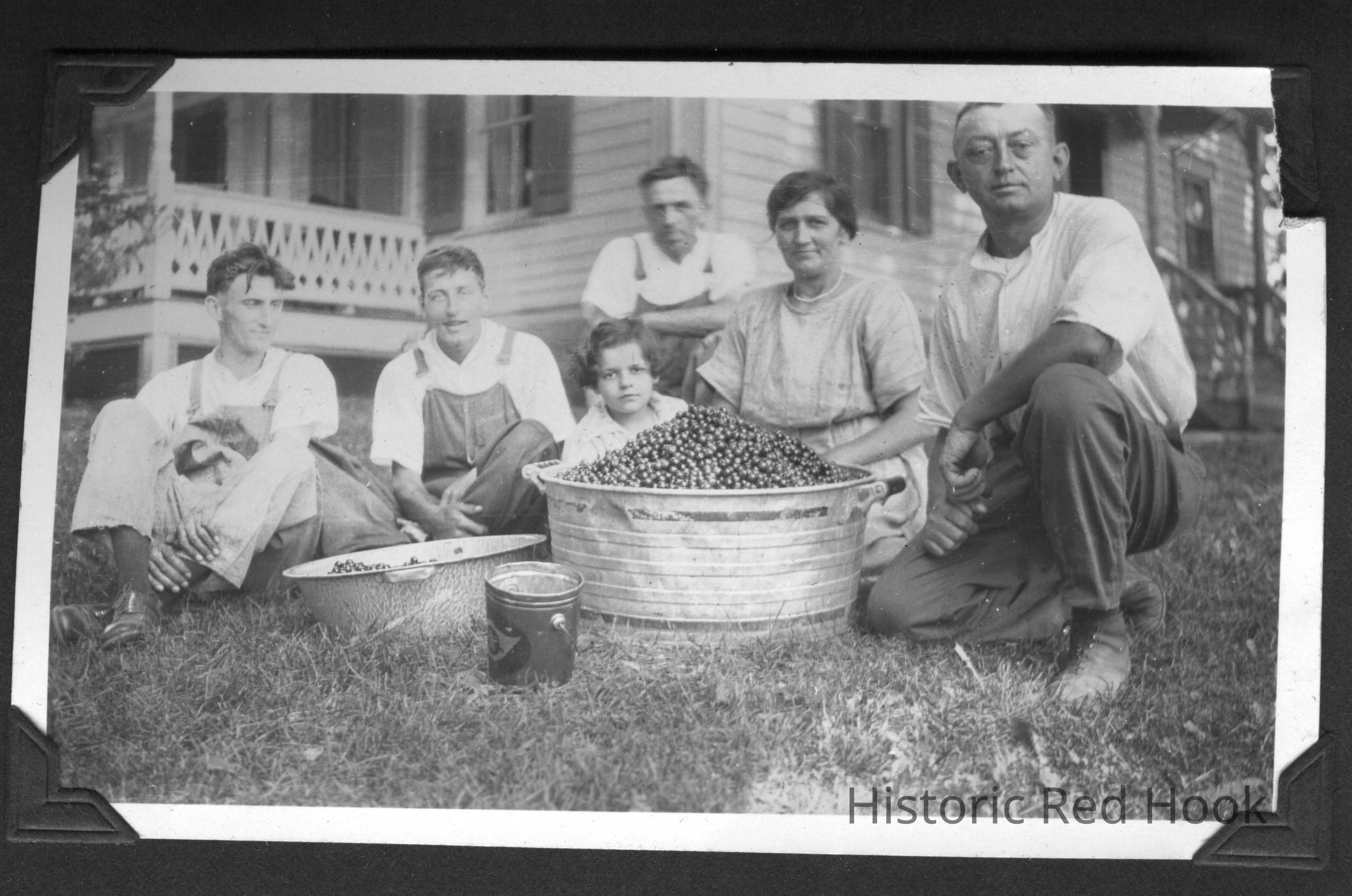 Henry Vogel, owner of the farm, kneels on the right. His wife Elise sitting on his left. Walter and Norman Vogel seated far left. Two middle people unidentified.Photograph Details