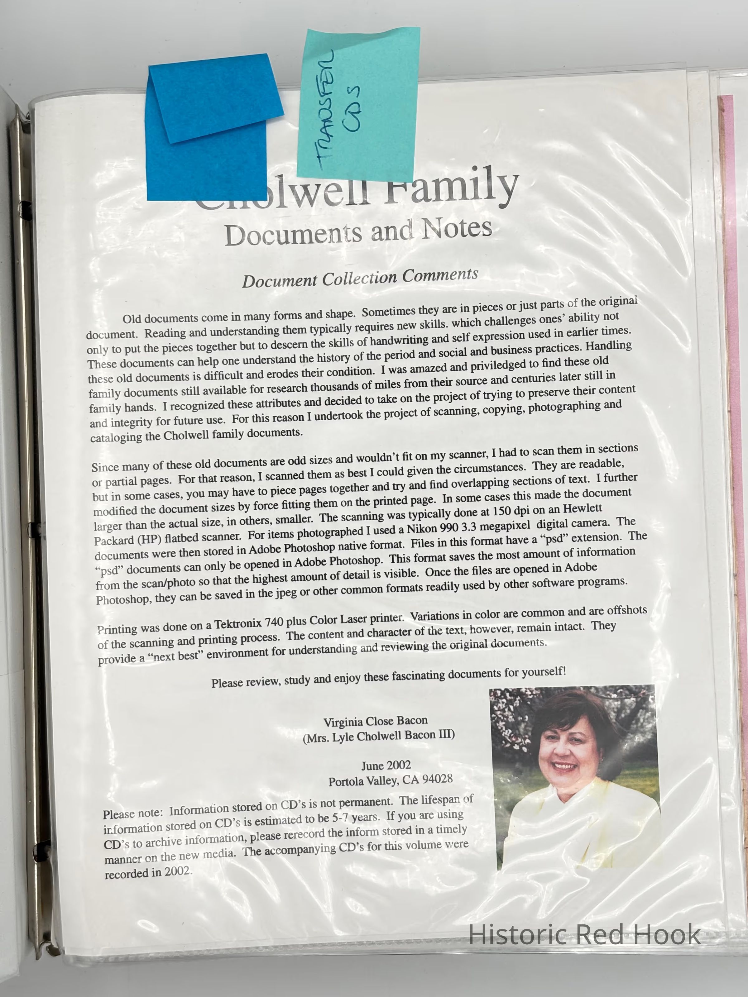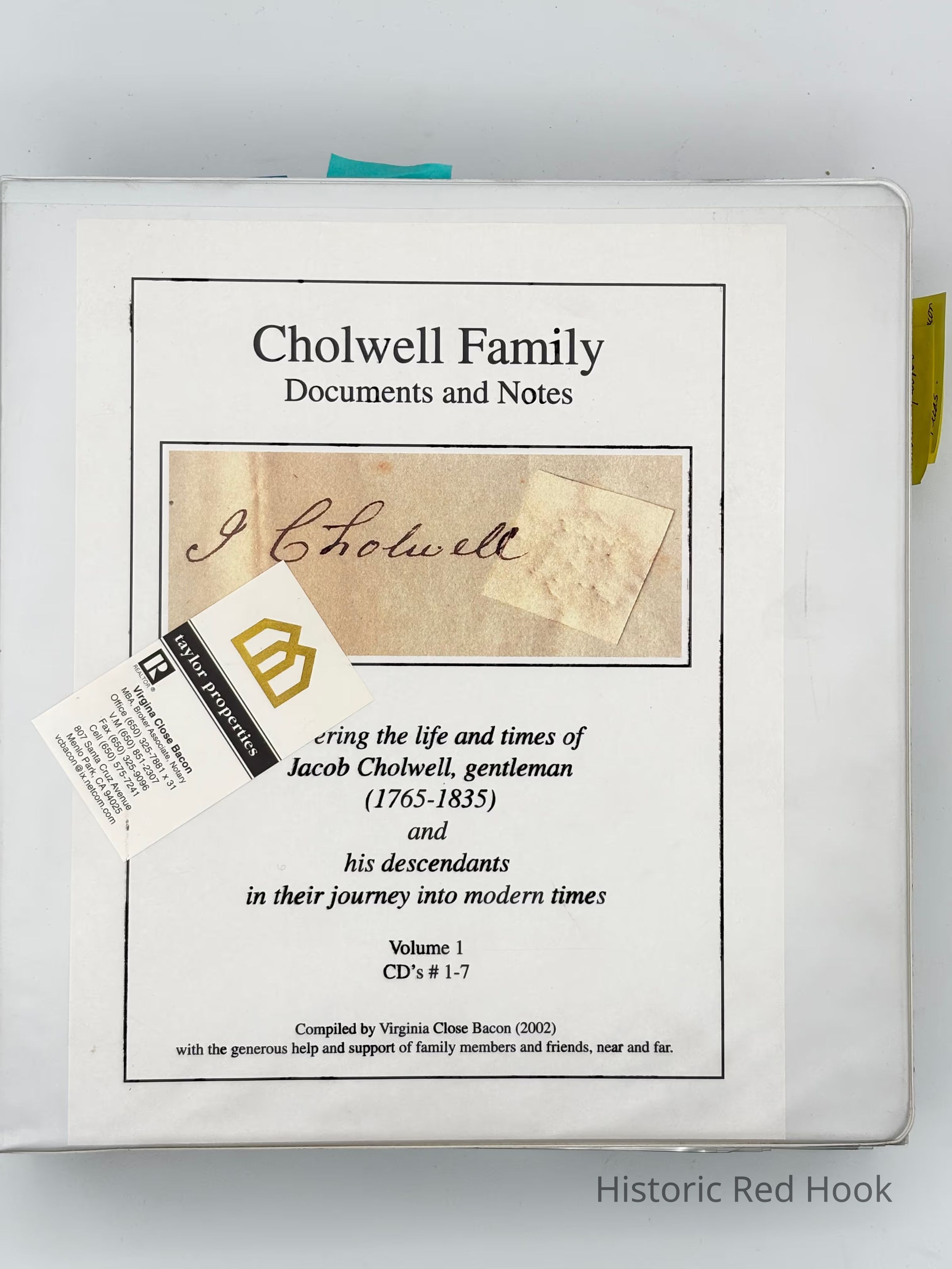 Loose-leaf notebook of genealogical information of the Cholwell family, compiled by Virginia Close Bacon in 2002.Collection