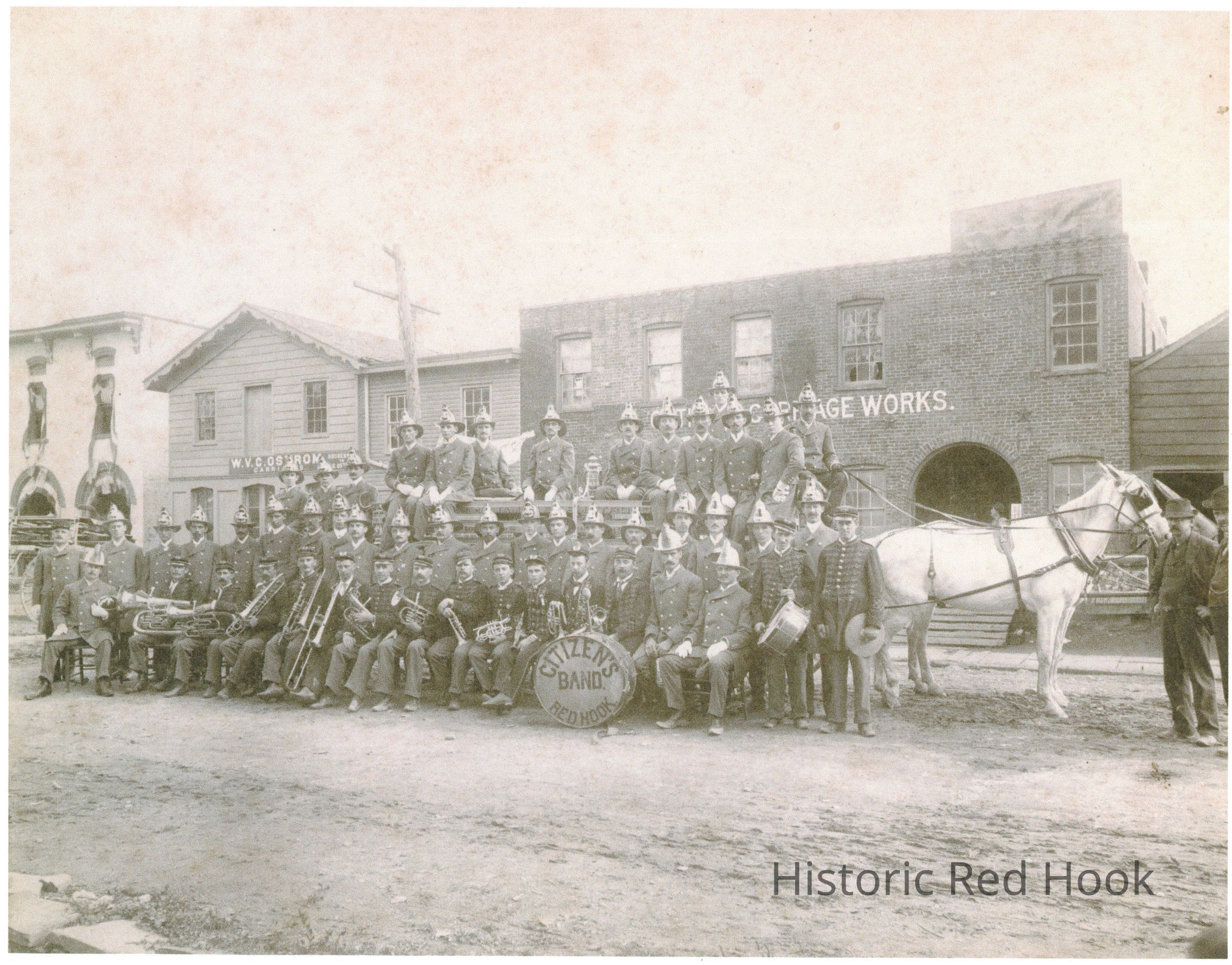 Citizens Band of Red Hook firemen's band posed with a horse-drawn pumper in front of a brick Carriage Works building (probably not Red Hook).Photograph Details