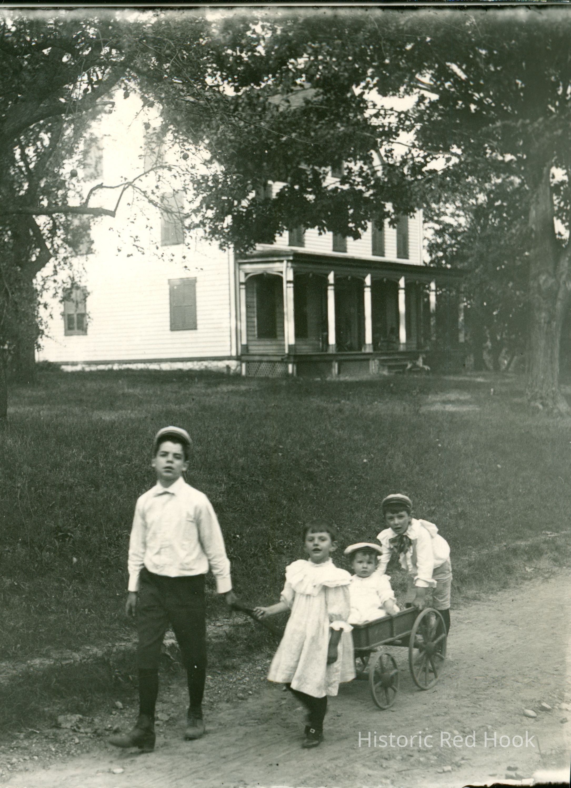 Outdoor photograph of Clarence Williamson and Marion Teator pulling a wagon and Roscoe Teator pushing in front of the WS Teator home in Upper Red Hook, New York ca1900.Photograph Details