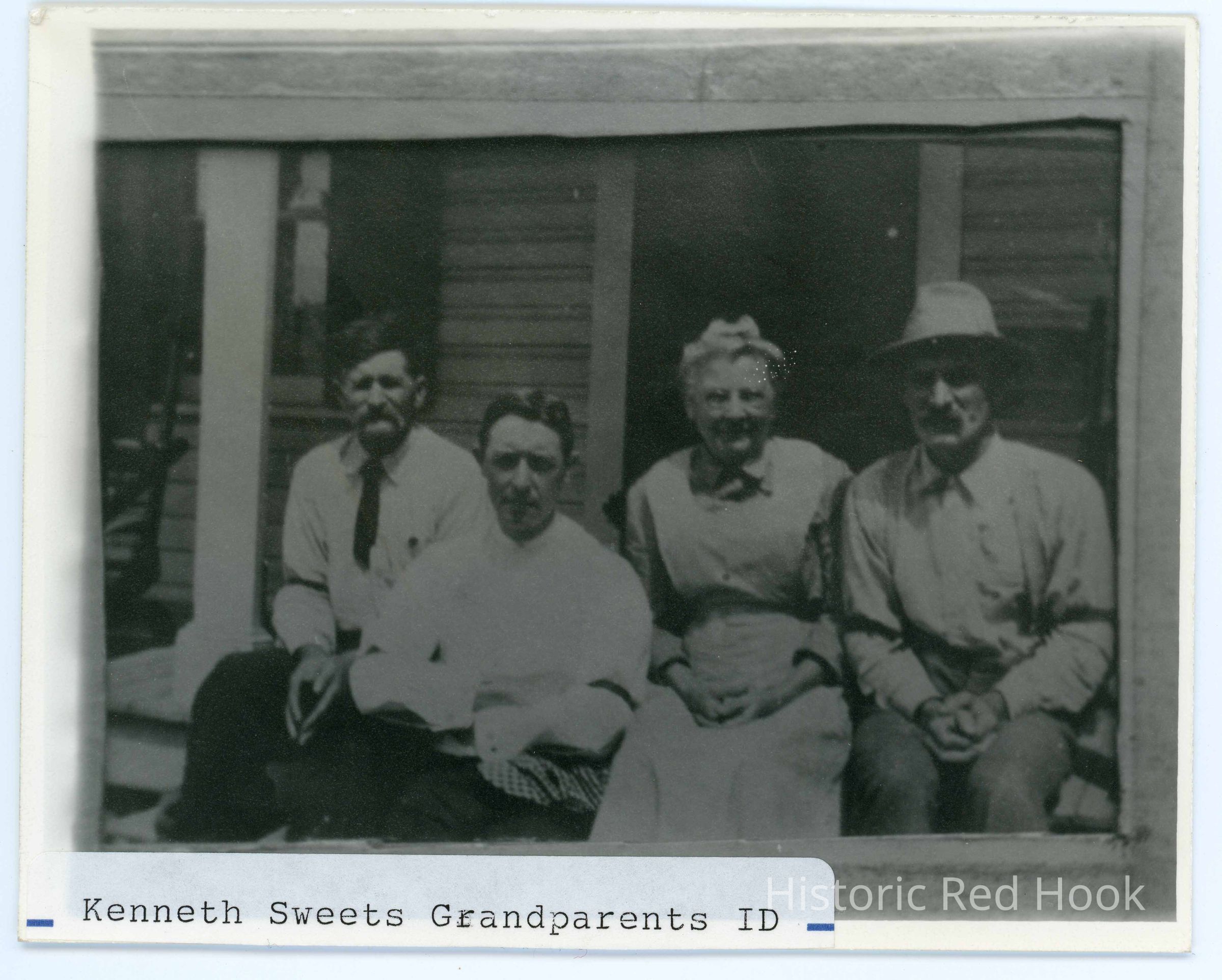 Photograph of three men and a woman seated on a front porch identified as Ken Sweets' Grandparents - Clement Sweet, Pete Hoyt?, Henrietta Doyle Sweet, Alfred Shafer. Also noted Lafayettes next to Campbell built houses & barn ; Jerome Sweet-Sons - Clem, Frank, Pedro, Dick -farmer from Clinton Corners, Melvin; Birthplace - Earl Sweet-Sweet Farm, Milan.Photograph Details