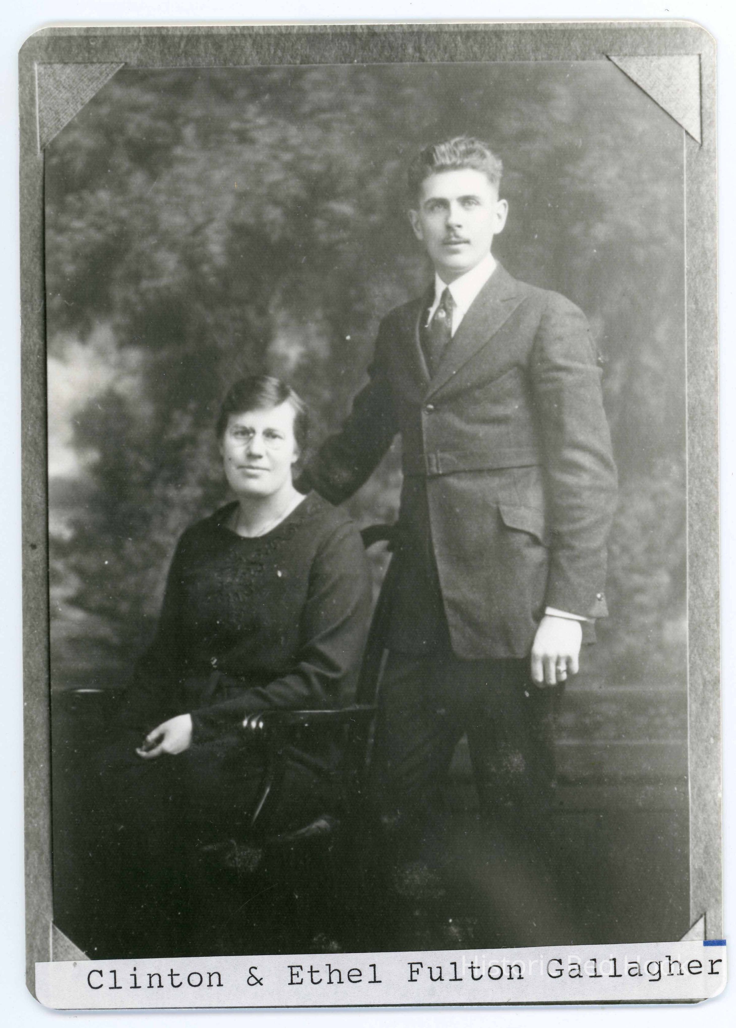Studio portrait of a man standing next to woman seated in a chair in front of an outdoor background screen identified as Clinton & Ethel Fulton GallagherPhotograph Details
