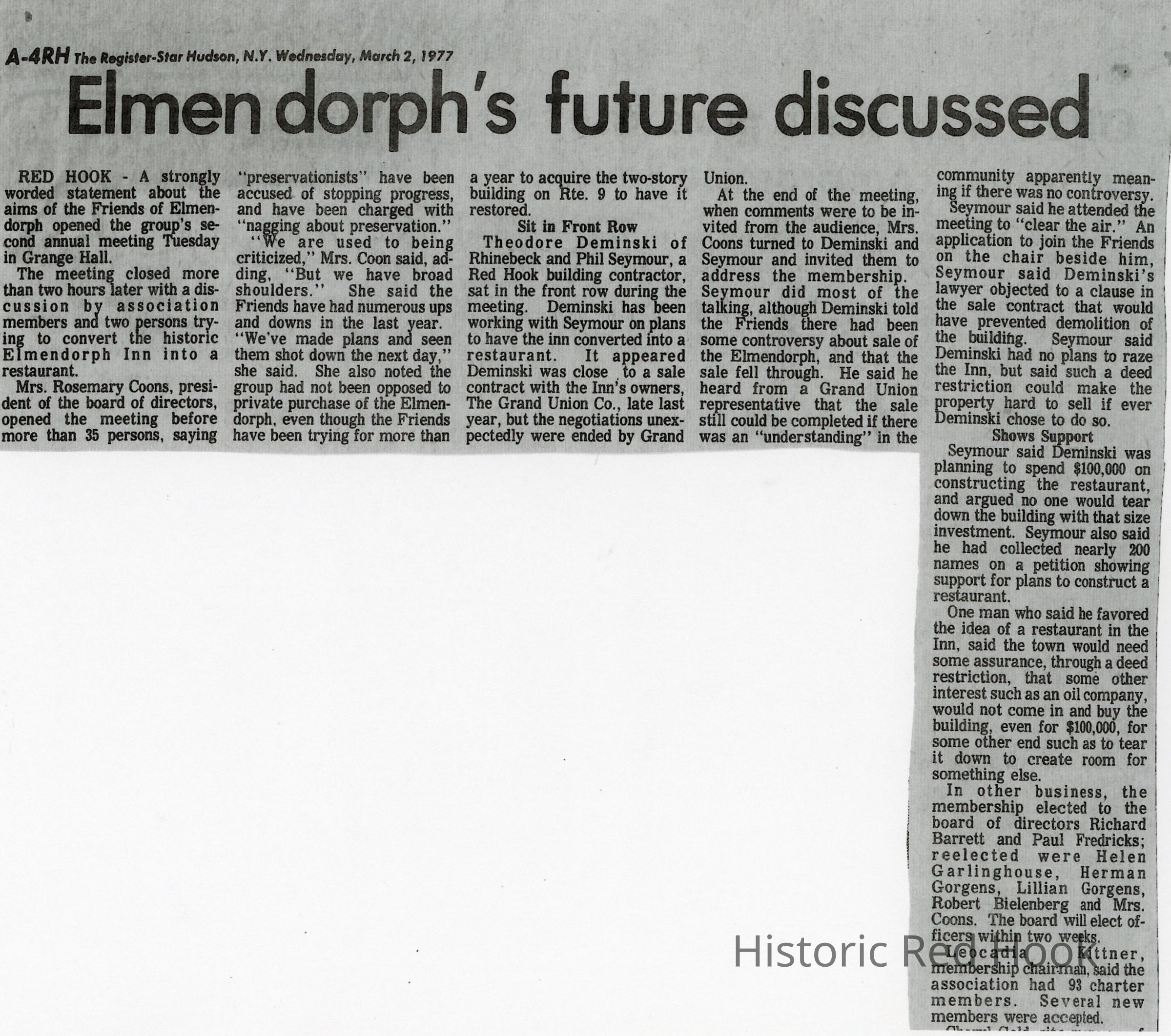 Clipping of article from Hudson Register Star, March 2, 1977 about a proposal to sell the Elmendorph Inn for conversion to a restaurant.Collection