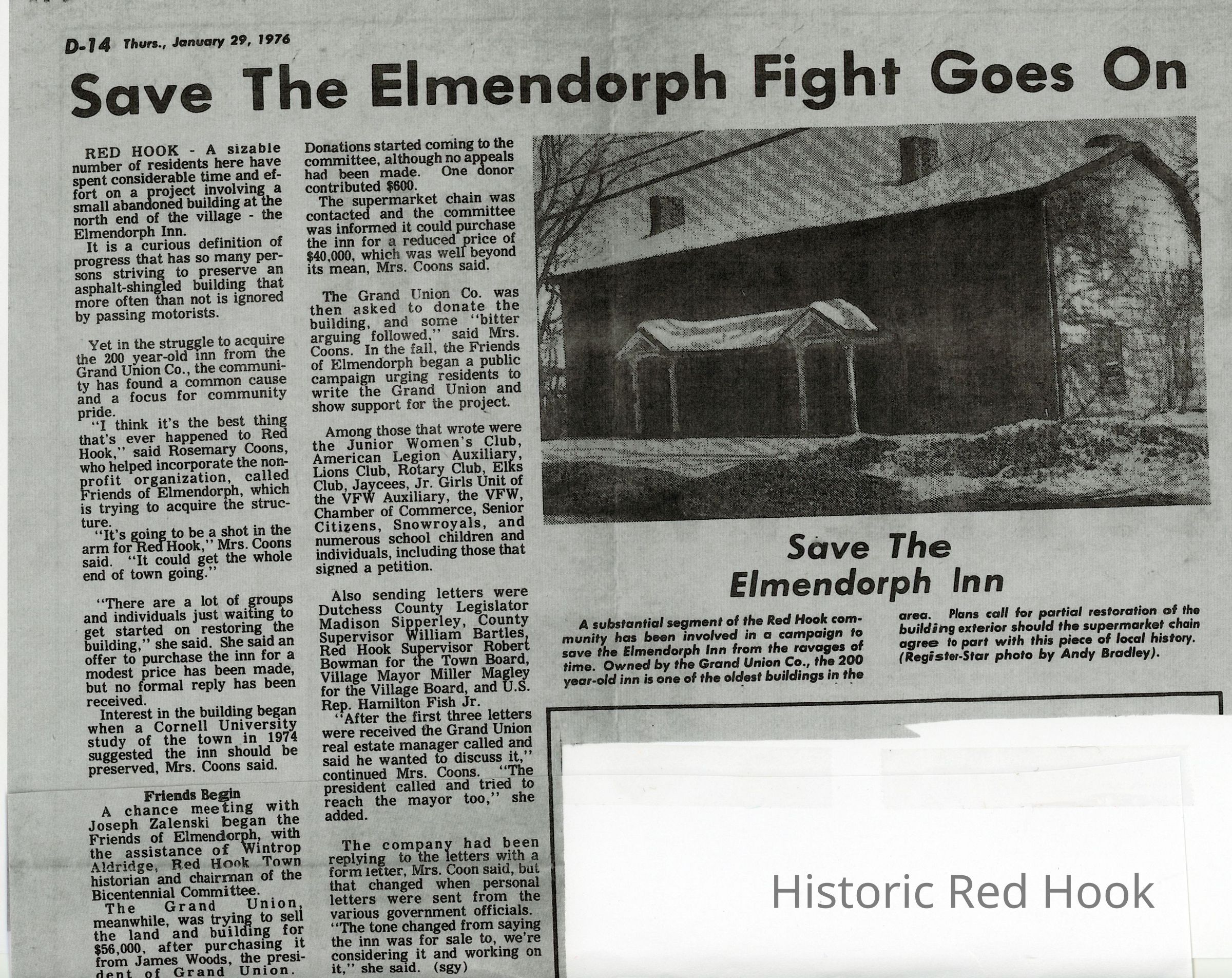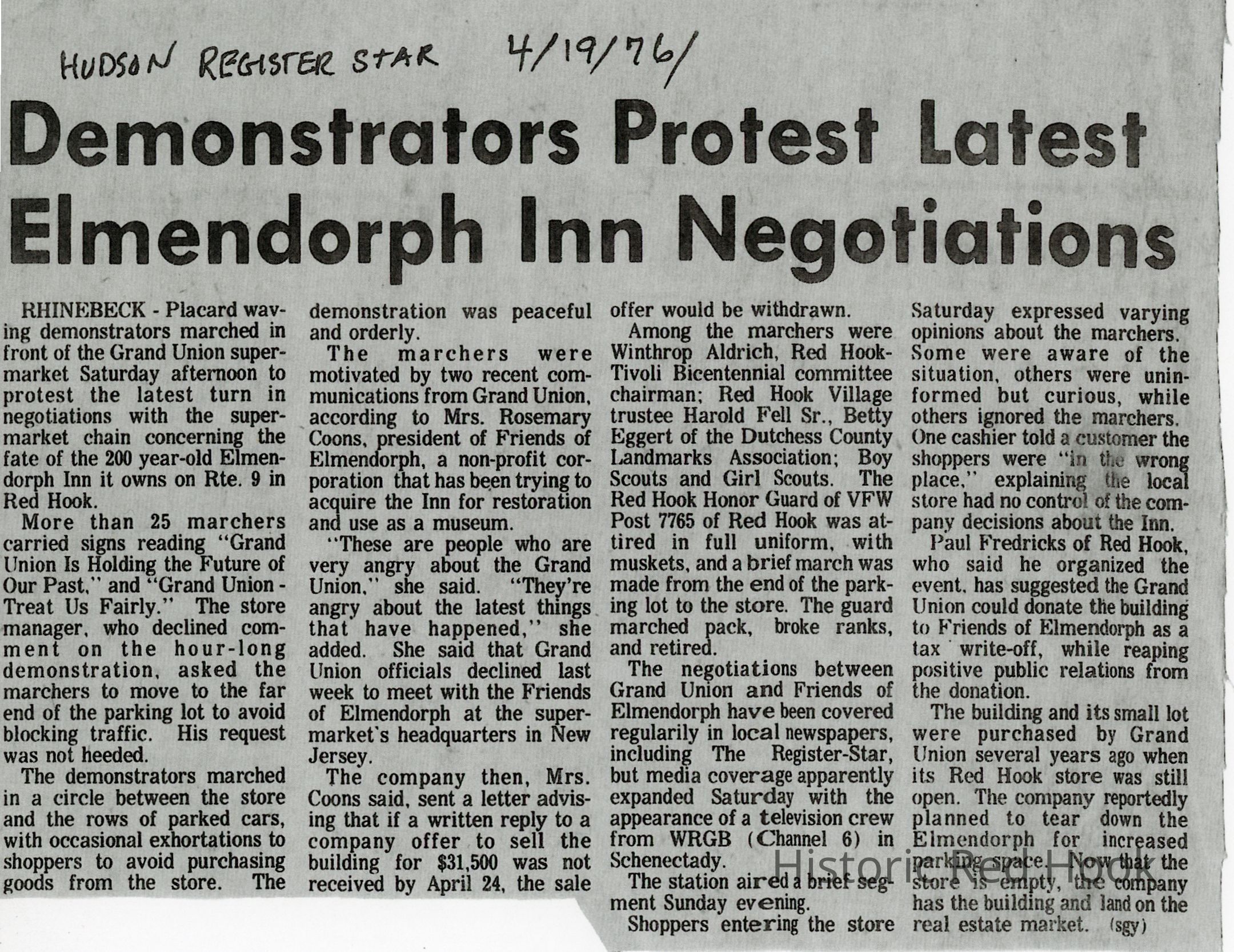 Clipping of article from the Hudson Register Star, April 19, 1976 about the demonstrations related to the negotiations to purchase the Elmendorph Inn from the Grand Union.Collection