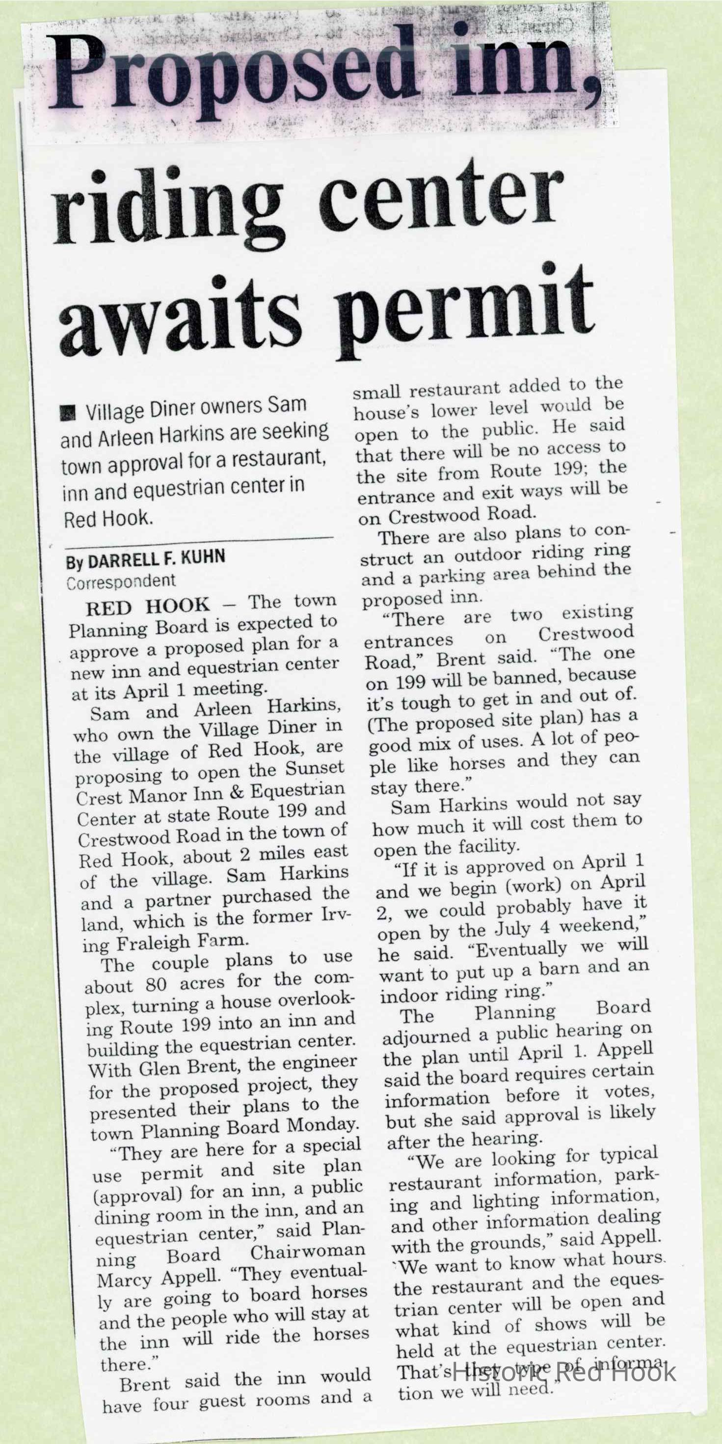Clippings about equestrian center proposed by Sam and Arlene Harkins when they owned the former Irving Fraleigh Farm, 2001-2002.