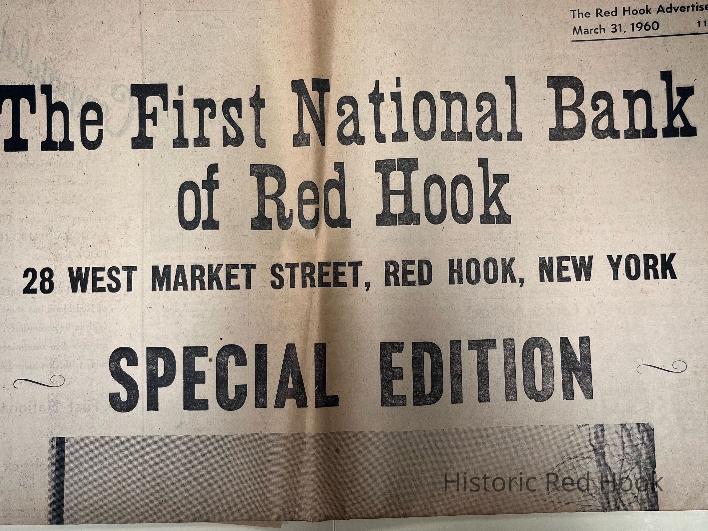 Articles from 1960 when the First National Bank of Red Hook opened on West Market Street, including a special edition from the Red Hook Advertiser.Collection