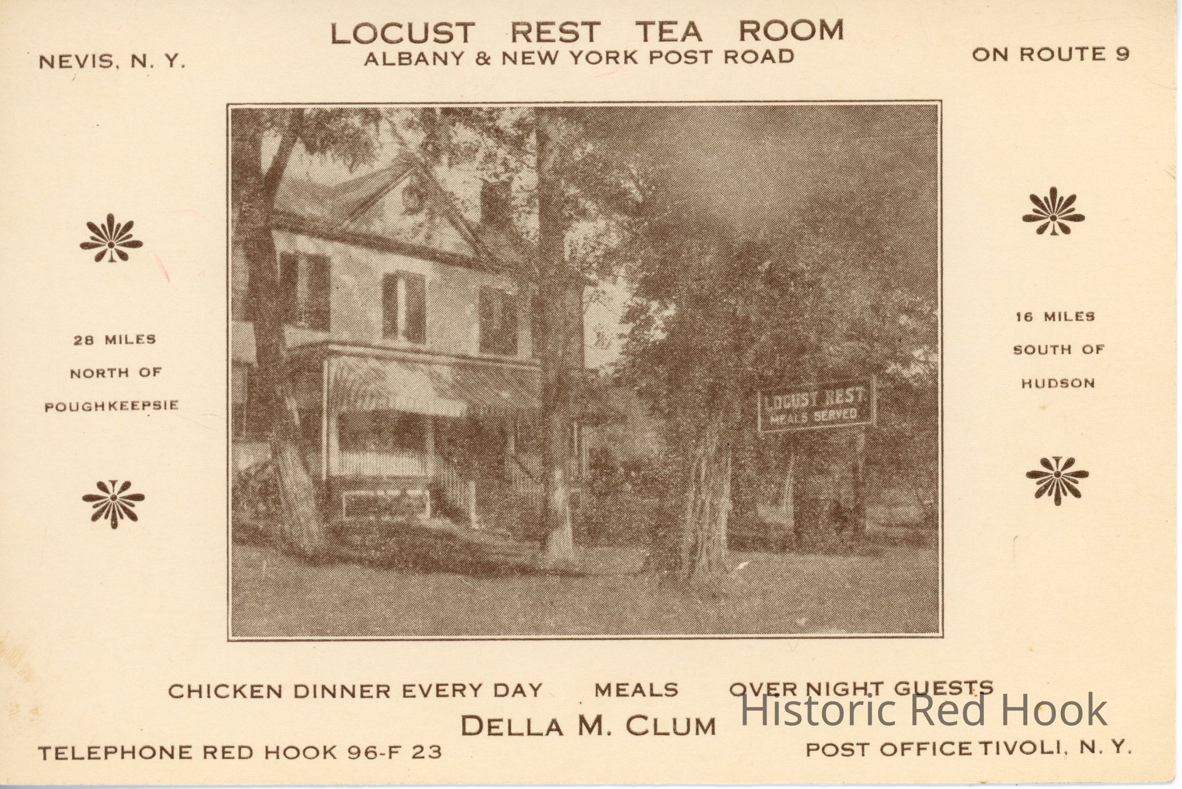 Large postcard advertising Locust Rest Tea Room, Nevis, N.Y. on Route 9. Chicken dinner every day, Meals, Overnight Guests, Della M. Clum, Telephone Red Hook 96-F 23, Post Office, Tivoli, N.Y. Blank on reverse.Subject Person/Organization