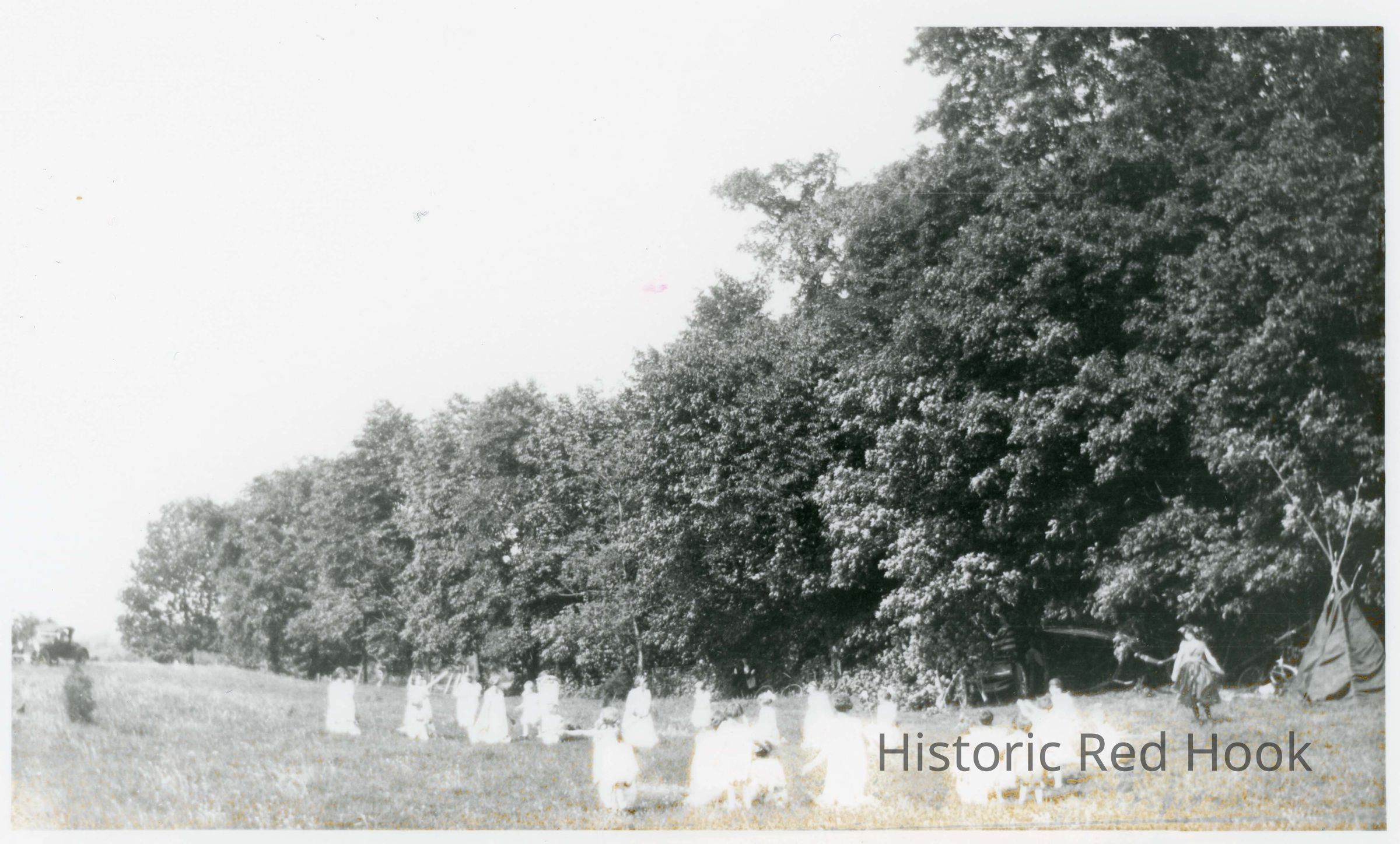 Upper Red Hook - Saulpaugh Hill. Community Pageant reeanactments held in field on the road to Spring Lake - 1920's. Group of young woman dressed in white. Teepee in background. (photos of same event in bathrick Coll 2018.011)Collection