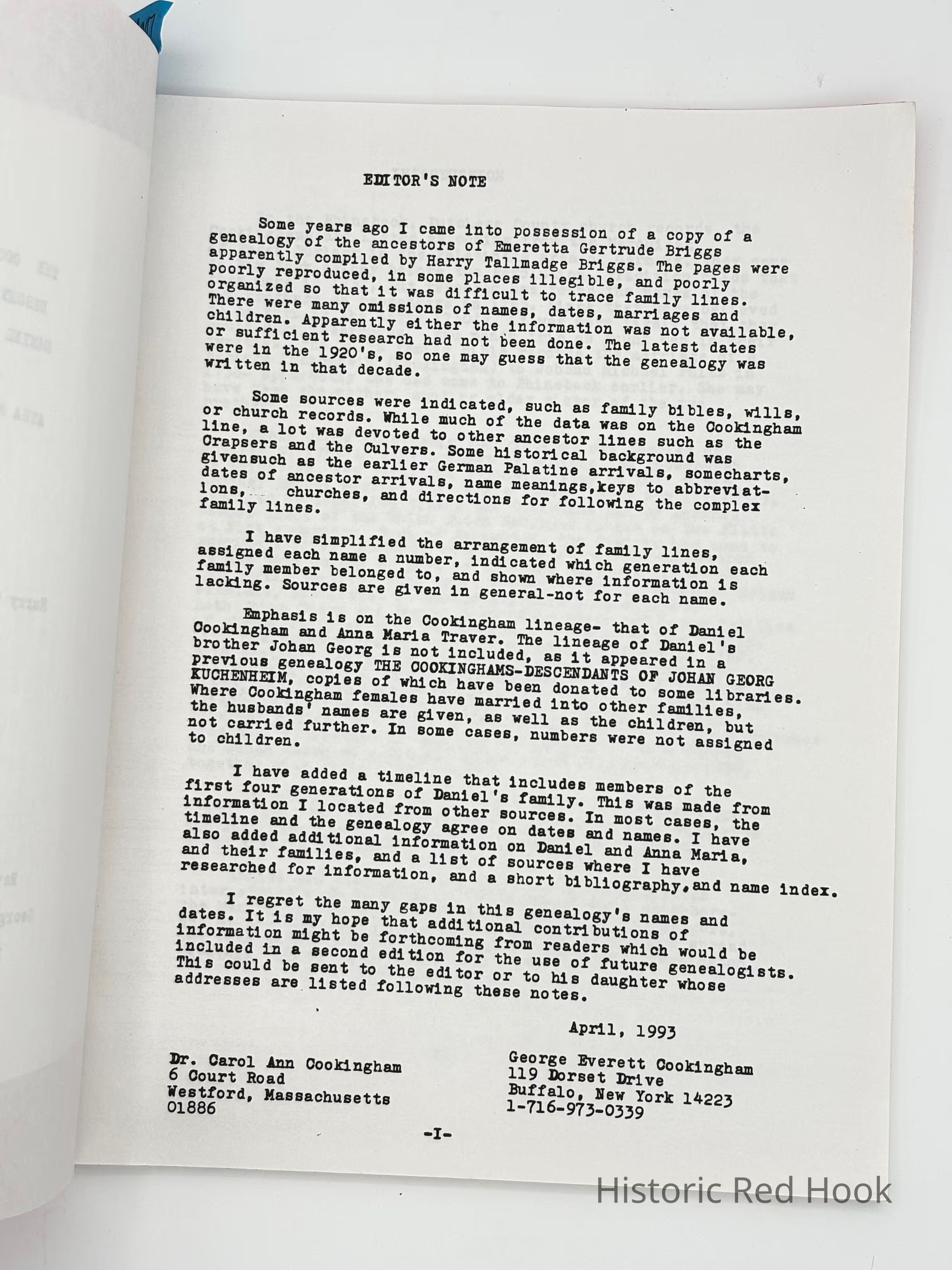 This 27 page paper bound booklet focuses on the Cookingham family lineage, "that of Daniel Cookingham and Anna Maria Traver." Starting with the arrival of the Cookinghams from the Palatinate area of Germany, about 1737 or 1753 depending on the source, it follows the growing family as members settled in Dutchess county, NY. and eventually to other adjacent counties. A general history of the Palatines is offered, as well as two timelines- one for the descendants of the Daniel Cookinghan-Anna Maria Traver family and the other for the Johan Georg Cookington-Anna Schmidt family. Multiple sources are listed including church records. A family tree is provided followed by a list of names.Collection