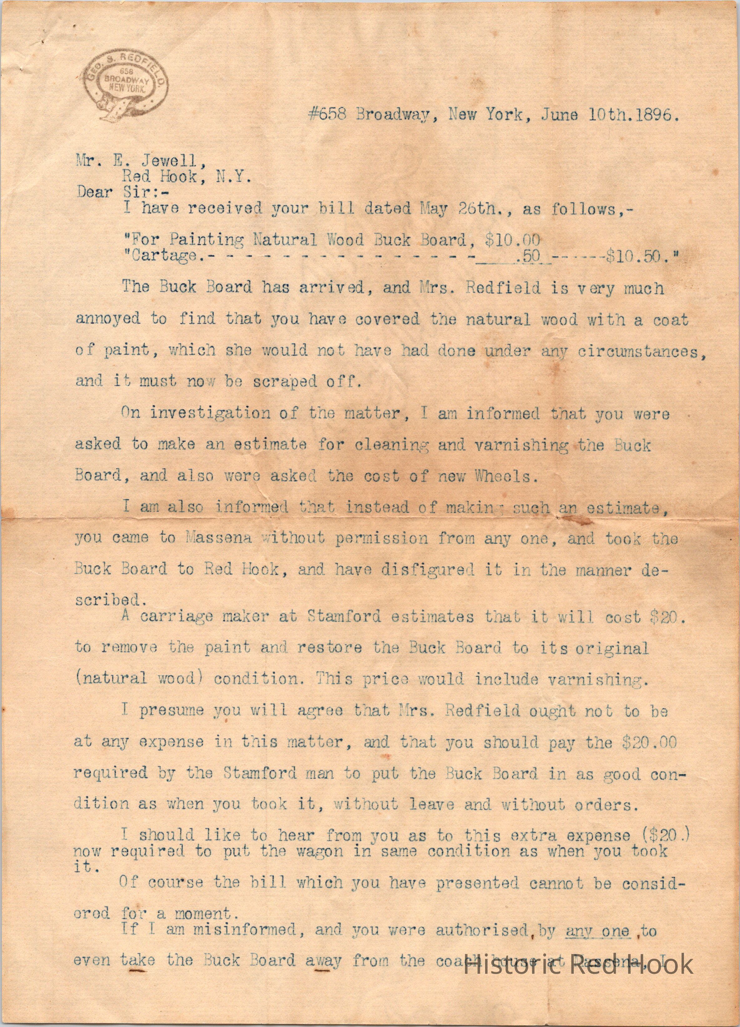 Letter from George Redfield addressed to Mr. E. Jewell, Red Hook, N.Y. dated June 10, 1896. The letter accuses Mr. Jewell of picking up a buckboard at the coachhouse at Massena without permission and painting it when he wasn't asked to.