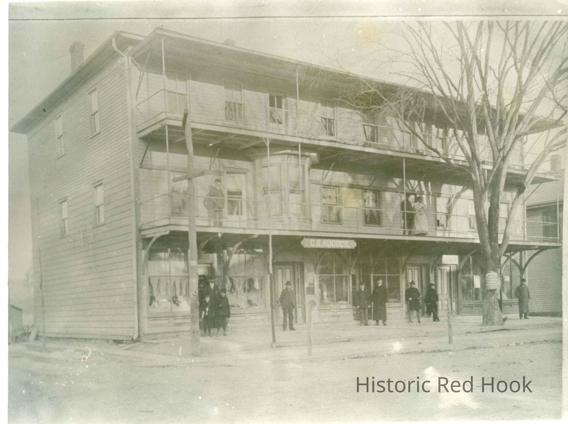 People gathered in front of G.S.Aucock store, Crane (later, Hobbs) building, corner Prince and South Broadway; note second floor balcony, man standing on left, black (?) couple on right.Photograph Details