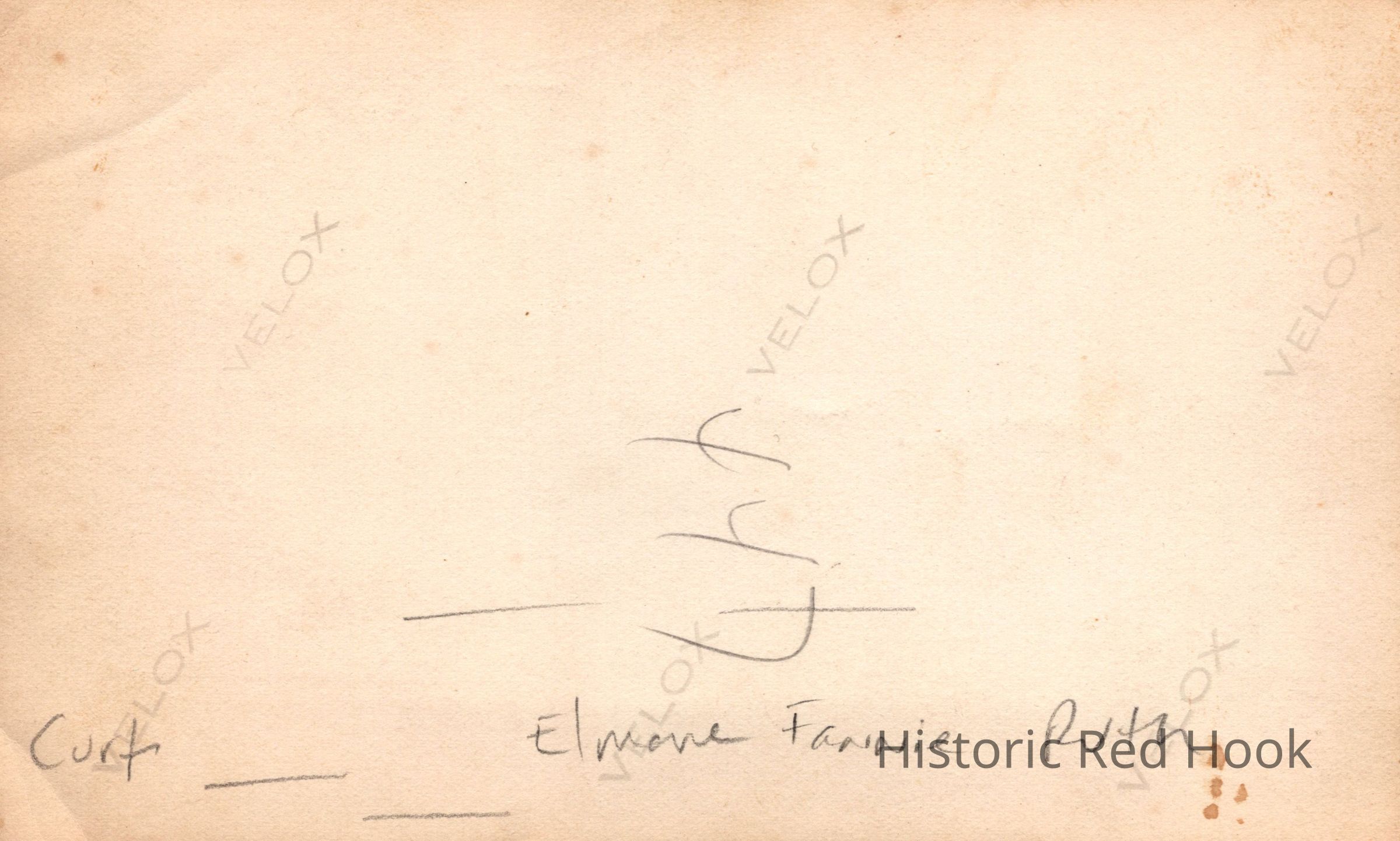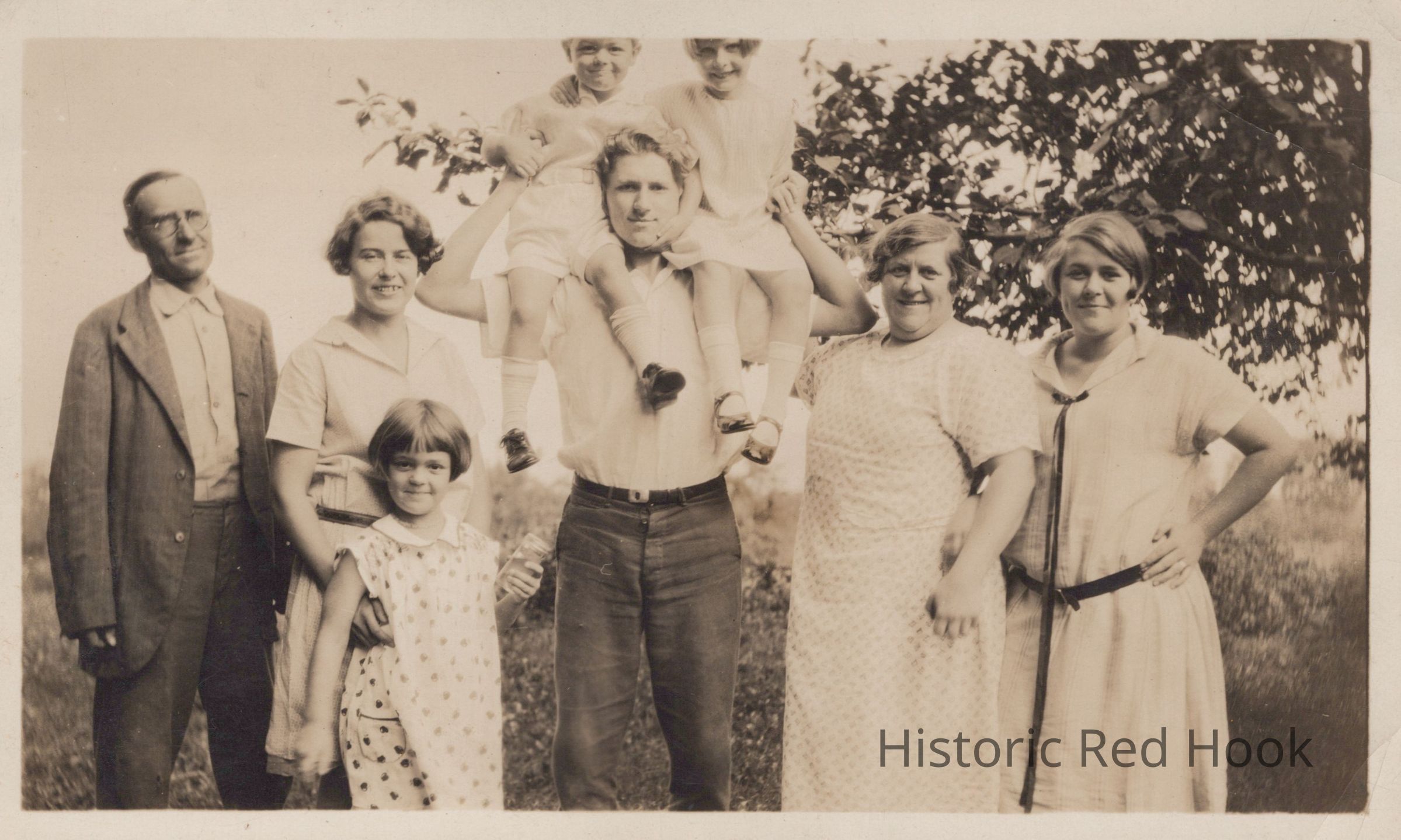 An informal group photograph of five adults and three children taken outdoors with identifications of 1st on left as Curt, center as Elmore, 4th as Fannie and 5th as Ruth. The children have not been identified.Photograph Details