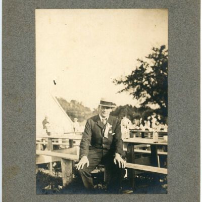 Black & white photograph mounted on cardboard of Robert W. Chanler ("Sheriff Bob") sitting at picnic table.Photograph Details
