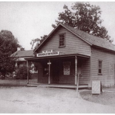 Annandale post office exterior. Sign says "Post office, Annandale-on-Hudson" and there is an 'ice cream, sodas' sign on the wall under the porch roof. 1914 written on photocopy.Collection