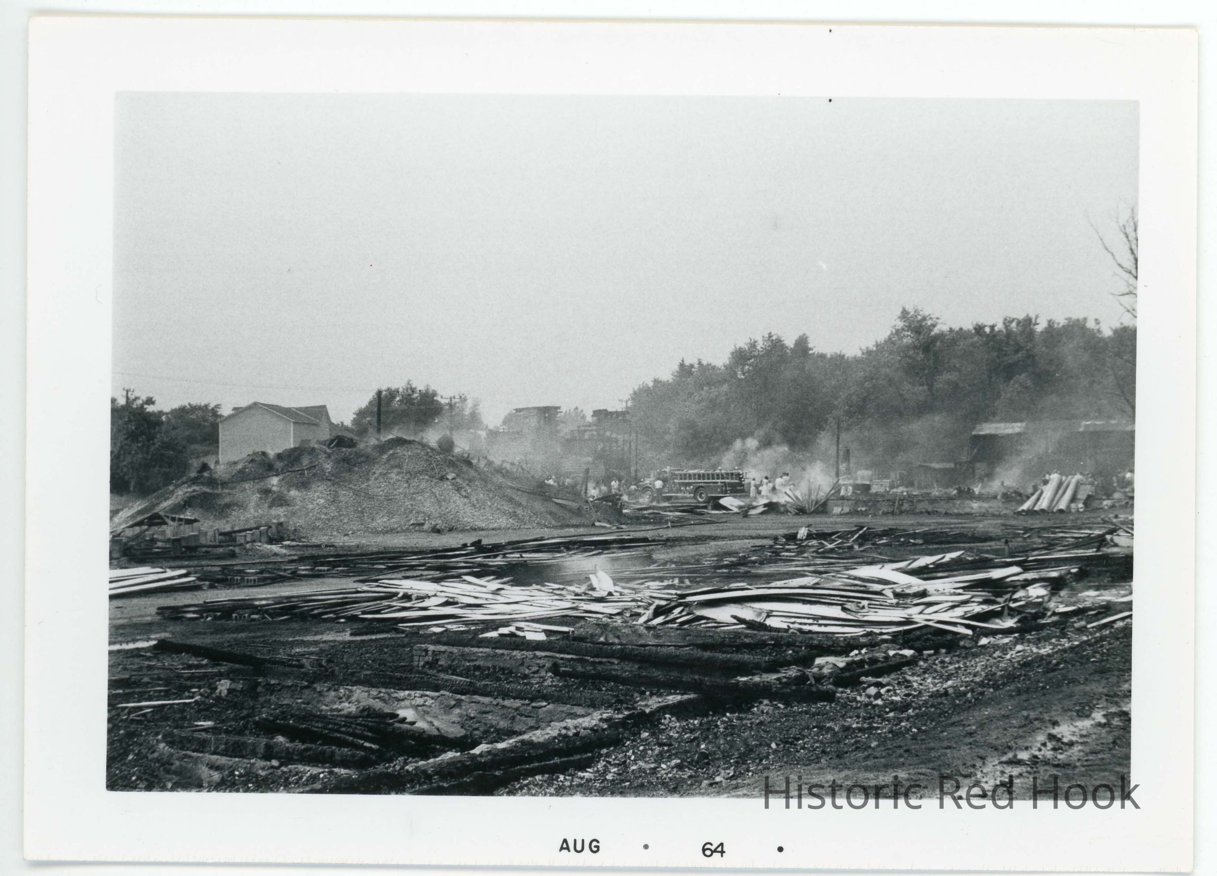 Scheffler Building fire. Image of fire truck in the distance with remnants of building on the in the foreground..Date on photo "Aug 64"Collection