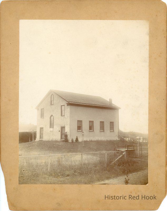 Shookville Church with a woman and two children standing in front. Graveyard adjacent on the right. Original photo mounted on cardboard.Photograph Details