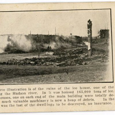 The Ice House was one of the largest on the Hudson River. It Housed 165,000 tons of ice. The power houses, one on each end of the main building, were totally destroyed and much valuable machinery is now a heap of debris. In the background was the last of the dwellings to be destroyed. There was no insurance.Collection
