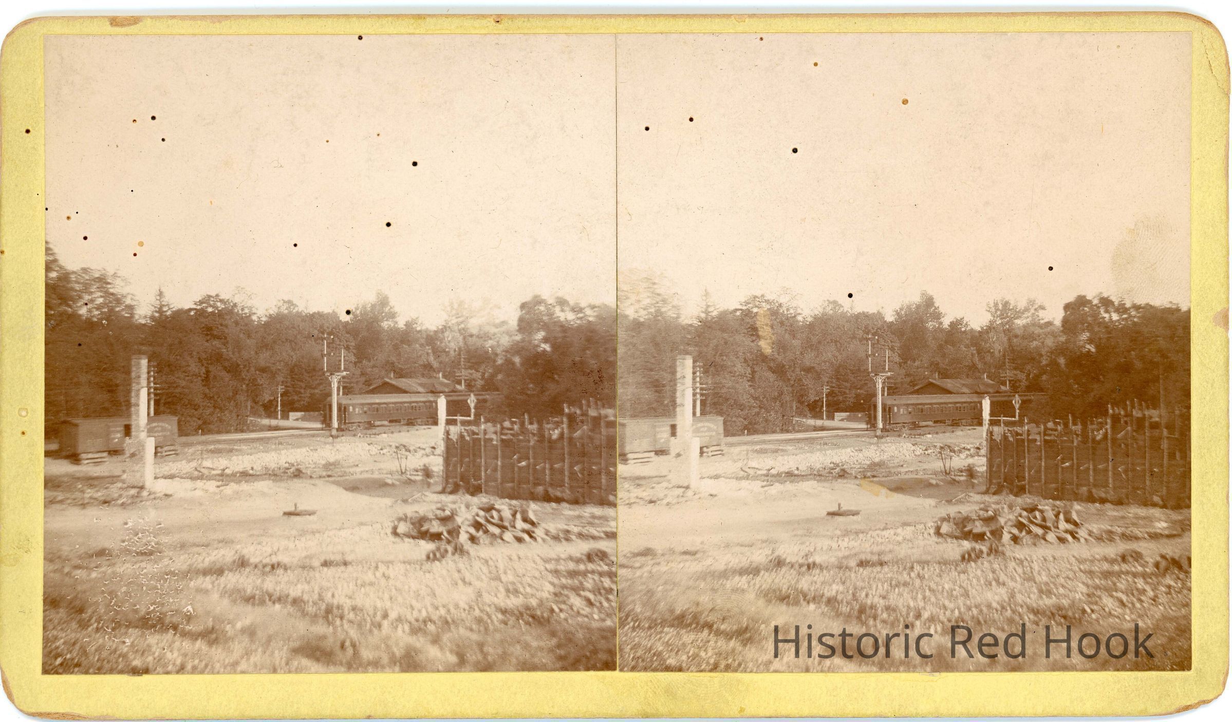 Barrytown Ice House Fire - Train standing below the fire area. 1908.