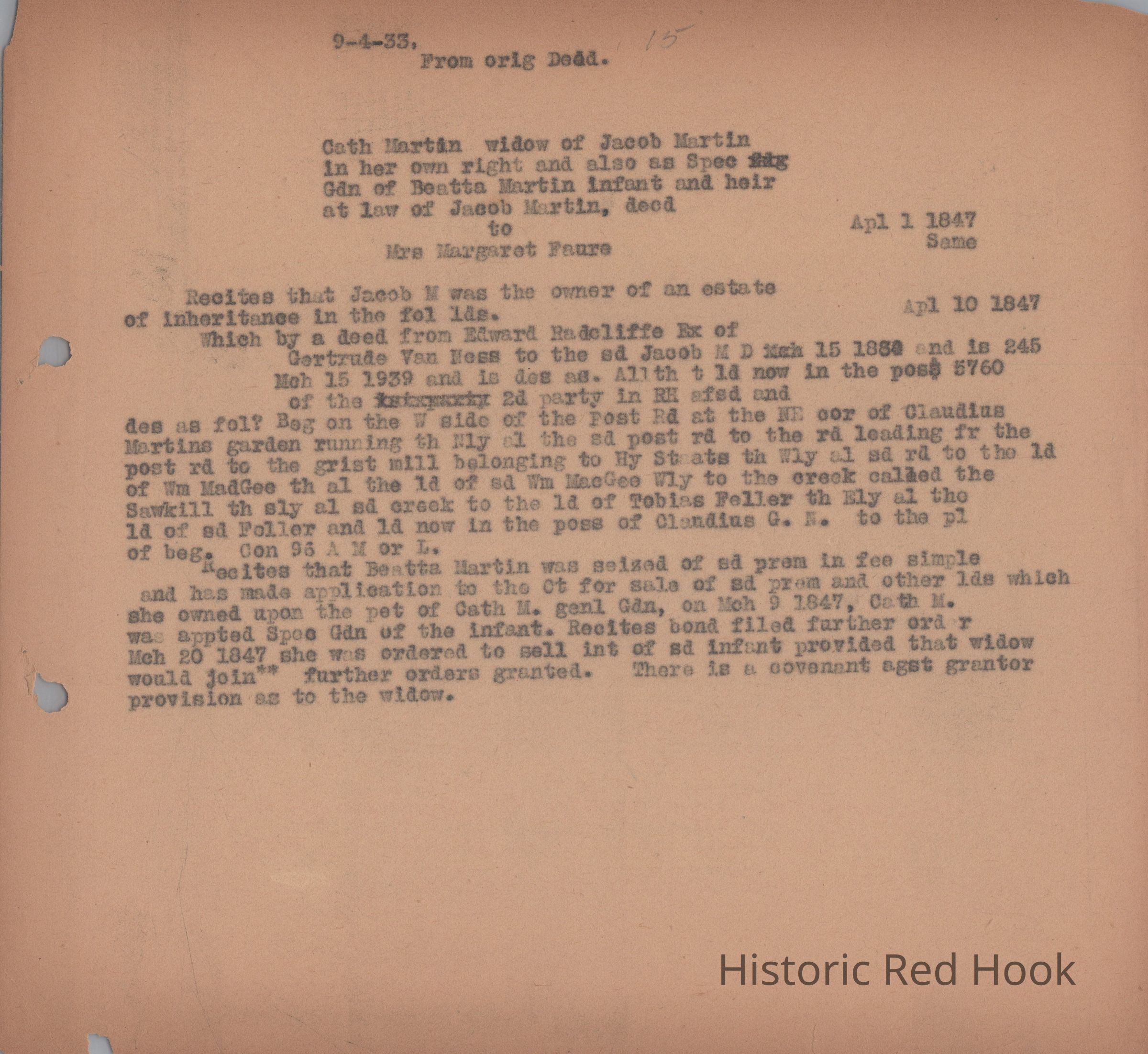 Transcription of Deed from Cath Martin, widow of Jacob Martin, and Beatta Martin, infant and heir of Jacob Martin, to Mrs. Margaret Faure, April 1, 1847Relationships