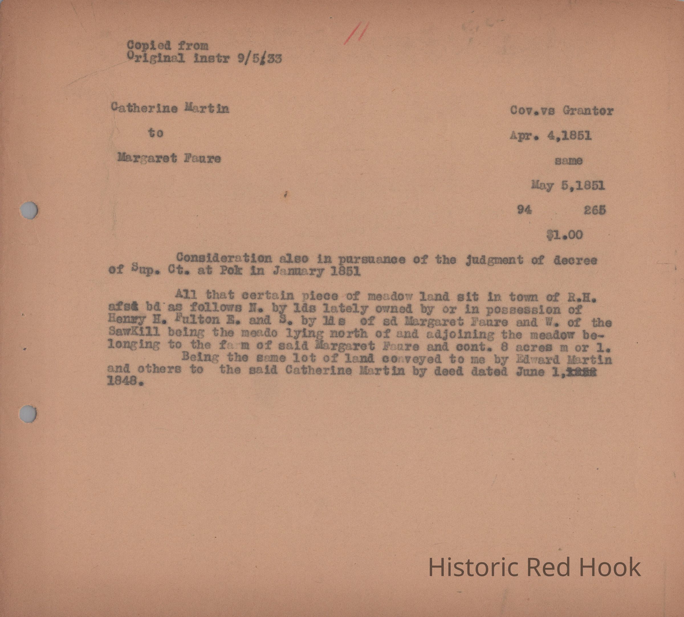 Transcription of Deed from Catherine Martin to Margaret Faure, May 5, 1851Relationships