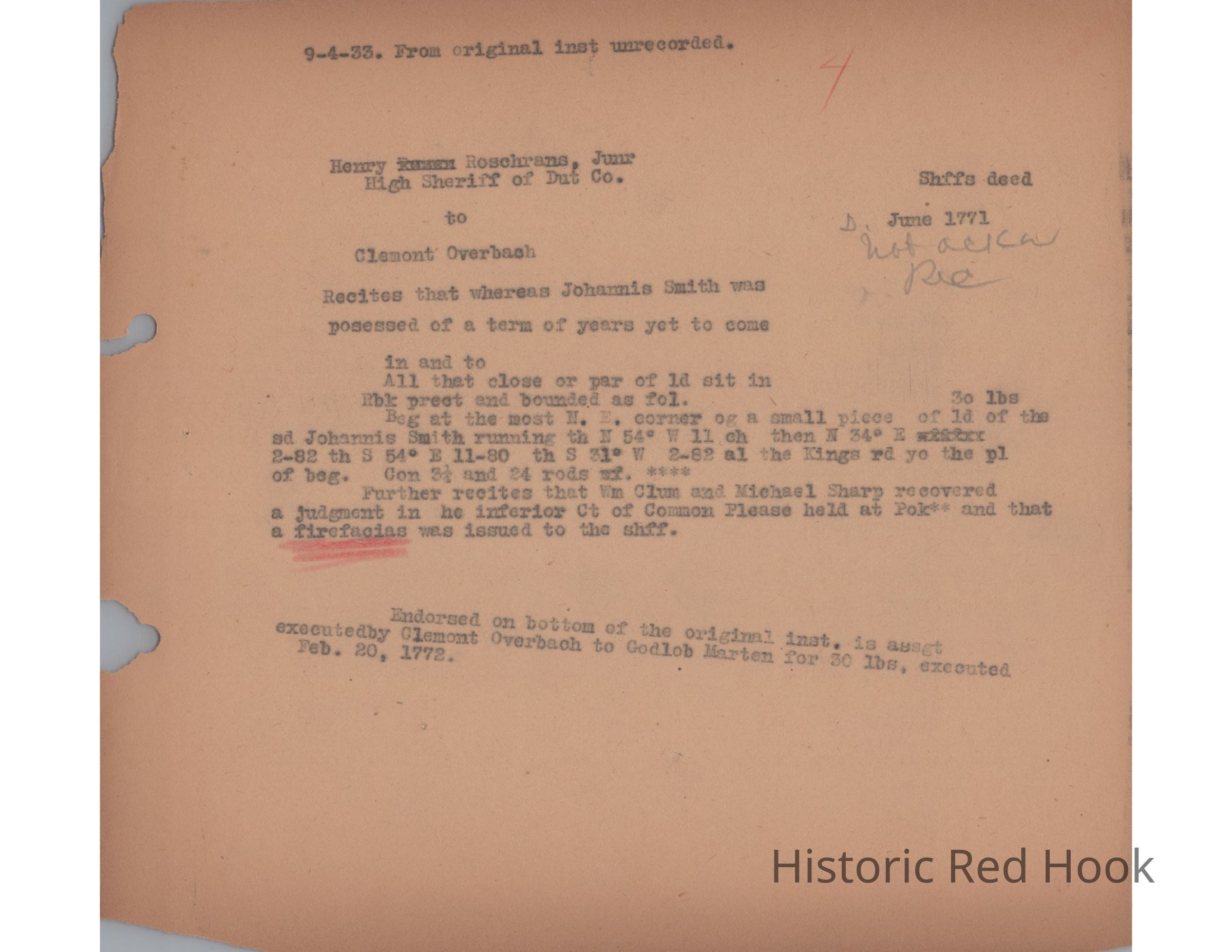 Transcription of deed from Henry Roschrans, Jr., High Sheriff of Dutchess County, to Clement Overbach, June 1771Relationships